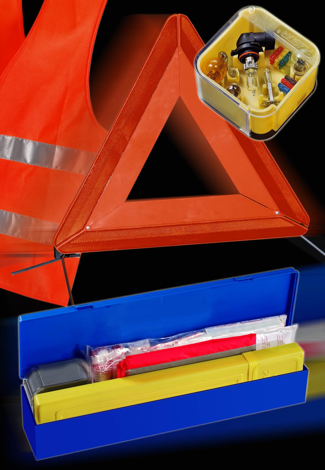 emergency sets, including warning vest, spare bulbs, fire extinguisher and warning triangles