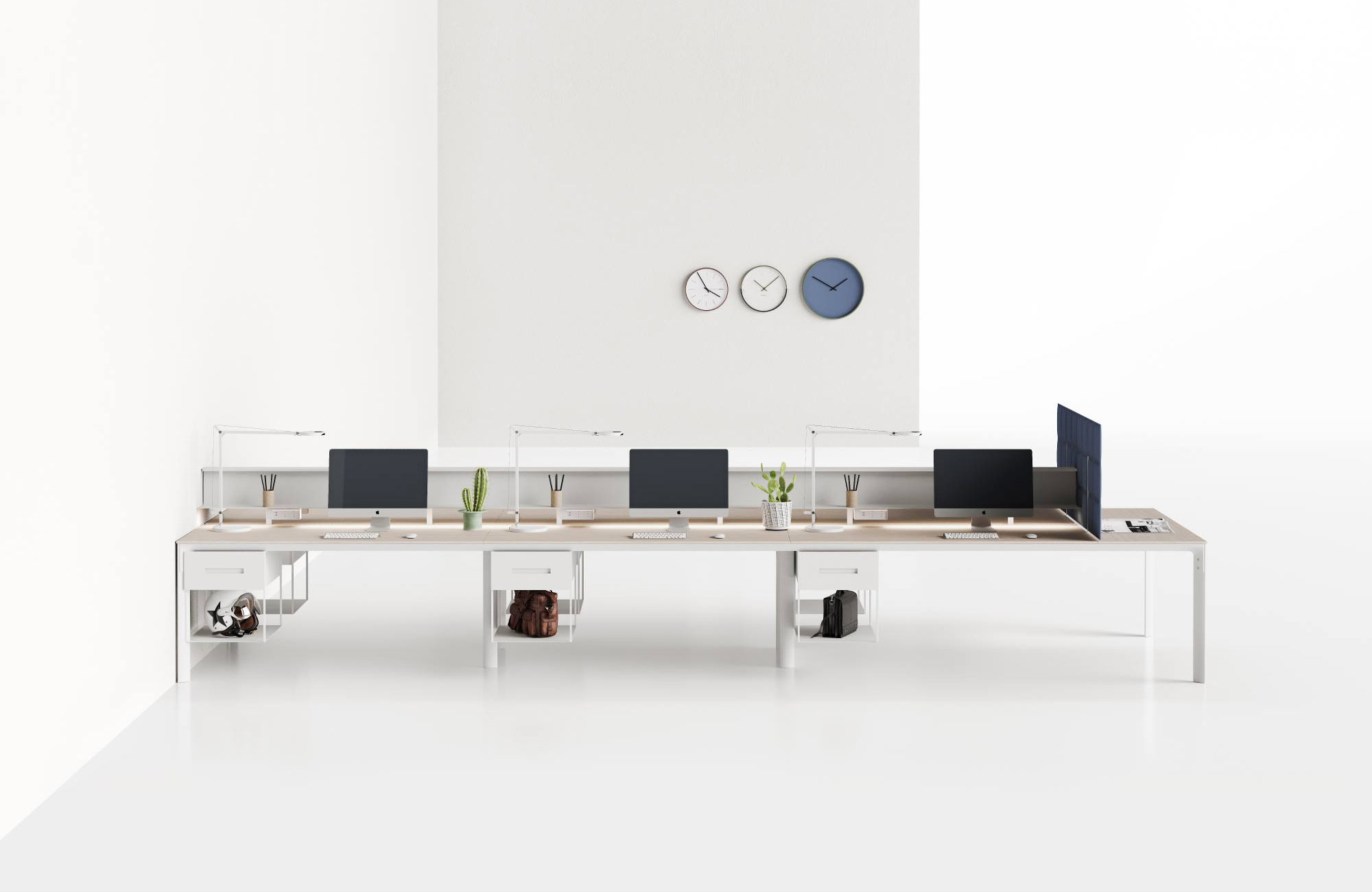 The office work environment is becoming more and more versatile. It is not only a place to work, but also to meet and chat, to eat and drink, to rest and relax and to do many other activities. The office system Fusion is what makes architecture functional and is what helps people do various activities in office. Every detail is carefully designed around people’s behaviors and activities in office space. There are designated storage spaces for personal and workplace belongings, to articulate and get better management of space. A variety of configurations create different atmospheres and landscapes, which are not only for solo and collaborative working, but also for impromptu meetings and short breaks in a more relaxed, home-like and less institutionalized environment. The office system FUSION is a “low-tech” product solution designed for a smart workplace, which requires an integrated behavioural approach to the office space based around new lifestyle and work-style trends, like co-sharing and co-working spaces. The workplace should be like a kind of social network, but with real people who want to express their personalities and individual characters even when they are working as a team. The furniture develops in height and length by connecting different leg configurations according to the client’s necessities. The Fusion system basically consists of: • a first level of single desks, available in multiple configurations with or without sliding tops. The desk tops open above a central cables tray to make it easy and user-friendly the access to plug bars and data connections. • On top of the desk height 73cm, the second and third levels (110 and 150 cm) are introduced to be able to add various functions. • Screens can be added to the second level and shelves can be added to the second and third levels. The screens are available with elastic bands that hold business cards and documents and/or pockets to keep magazines and newspapers. Under the rectangular shelves, hidden hooks can be added to hang personal belongings and small accessories. The round shelf fixed to the 40 x 40 mm structures functions as an integrated coat stand thanks to the hooks under the round shelf. • “Charger boxes” fitted with plug bars serve as a desktop height accessory for smartphones and tablets when batteries are low. Charger boxes have a space at the top dedicated for stationaries such as pens, clips and staplers, or small plants for people who like to personalize their space. • Stand-up “touch-down” semi-circular tops are available at 110 cm height which can be used for a work place or for “chatting”. • Below the desktop height, “storage boxes” are available for personal belongings such as work bags and computer bags. Also, hooks are provided externally for other personal objects. • The Fusion system includes a range of sofas which can be integrated into the layout for dedicated lounge and informal meeting areas in and around the desks. Low tables can be combined with the sofas and the charger boxes can also be placed on the tables for phone charging or laptops connection. • The structure goes up to 220 cm in height. A fabric roof creates a more intimate “hub” working situation. It also gives you a relaxed and home-like environment, with a feeling of working at a terrace outdoor.