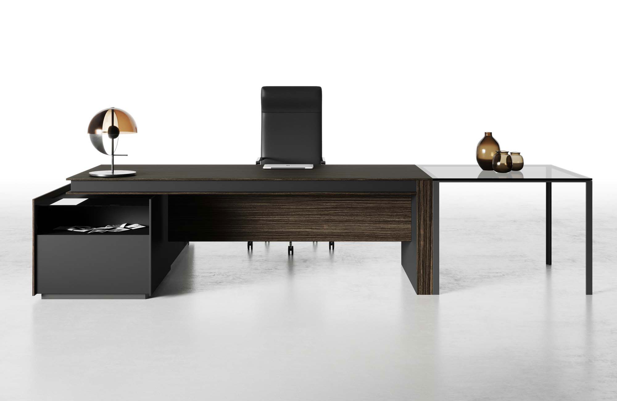 The Vittoria desk’s design is inspired by an aesthetic and referential approach to architectural values. The process of form identification is achieved through the construction of various functional elements and the variation of different distributive layouts. By exploiting the use of the technical characteristics of laminates and of metal, it is possible to combine solidity and lightness as modern architecture requires. The principle of formal discretion gives an identity to the design without being invasive. The top surface of this desk accentuates the horizontal alignment, and the intersection of the side desk defines a space that is functional but at the same time meticulous. The union of the materials is inspired by contemporary urban architecture. Stone, wood, crystal and metal are reproduced with balance in the various components. Everything is designed to be functional but also invisible: the double layers and the panel grooves allow the presence of various technical cabling. The flush crystal cases work as open compartment units: they enhance a feeling of prestige, transmitting the perception of the furniture as an architectural element. The crystal courtesy frames show that we are in executive mode and hint to private corners whilst being aesthetically functional in concealing any monitors or computers. The laminate tones belong to the warm grey and natural oak, combined with bronze and metal. The design finishing mixes the neutral tones of the tobacco with the sand colors; furthermore, the metals have a pleasant effect and are easily placeable. The use of dark colored crystals enriches the design with elements of depth and contrast. The designs have been realized using the latest generation of technical laminates which give intrinsic material characteristics to the furnishing surface. The technical marble tops give an added value of exclusivity and individuality. This project reveals multiple configurations and introduce the concept of glass showcase: a simple accessory that can become a privacy screen or a storage compartment. The Vittoria desk is characterized by the linearity, elegance and dignity of the materials. The top and the side desk are in honeycomb core with double laminate panels, with brushed oak texture in tobacco and ash grey oak finishes. The desk can be equipped with 6mm Gres with Sahara Noir and Calacatta Gold finishes. On desks a meeting smoky grey glass meeting table with metal structure can be added.
