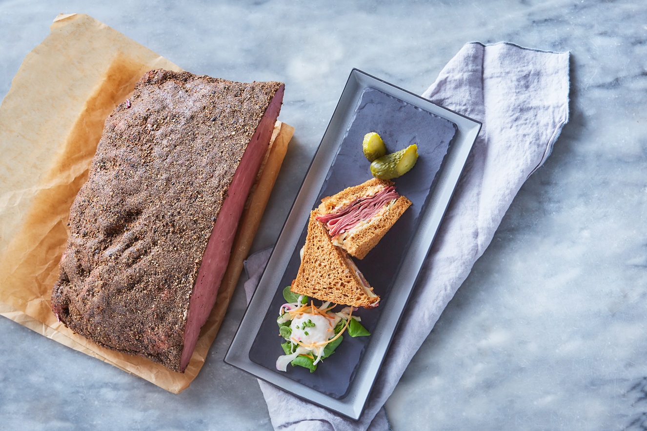 Selected beef, richly coated with spices including black pepper, garlic, coriander and paprika, smoked with natural beechwood and oven-cooked. Also available in slicing bars and with sous-vide, low-temperature cooking.