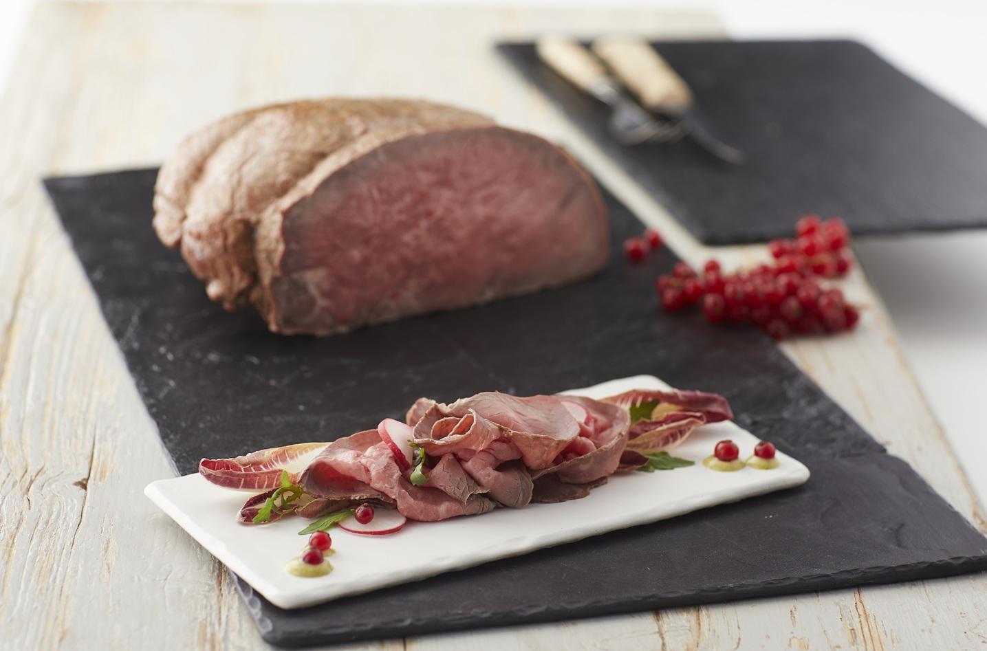 Beef topside dry-salted with salt, natural seasonings and rosemary, oven-cooked English-style like roast-beef. Also available with silverside cuts from EU breeds and from black angus.