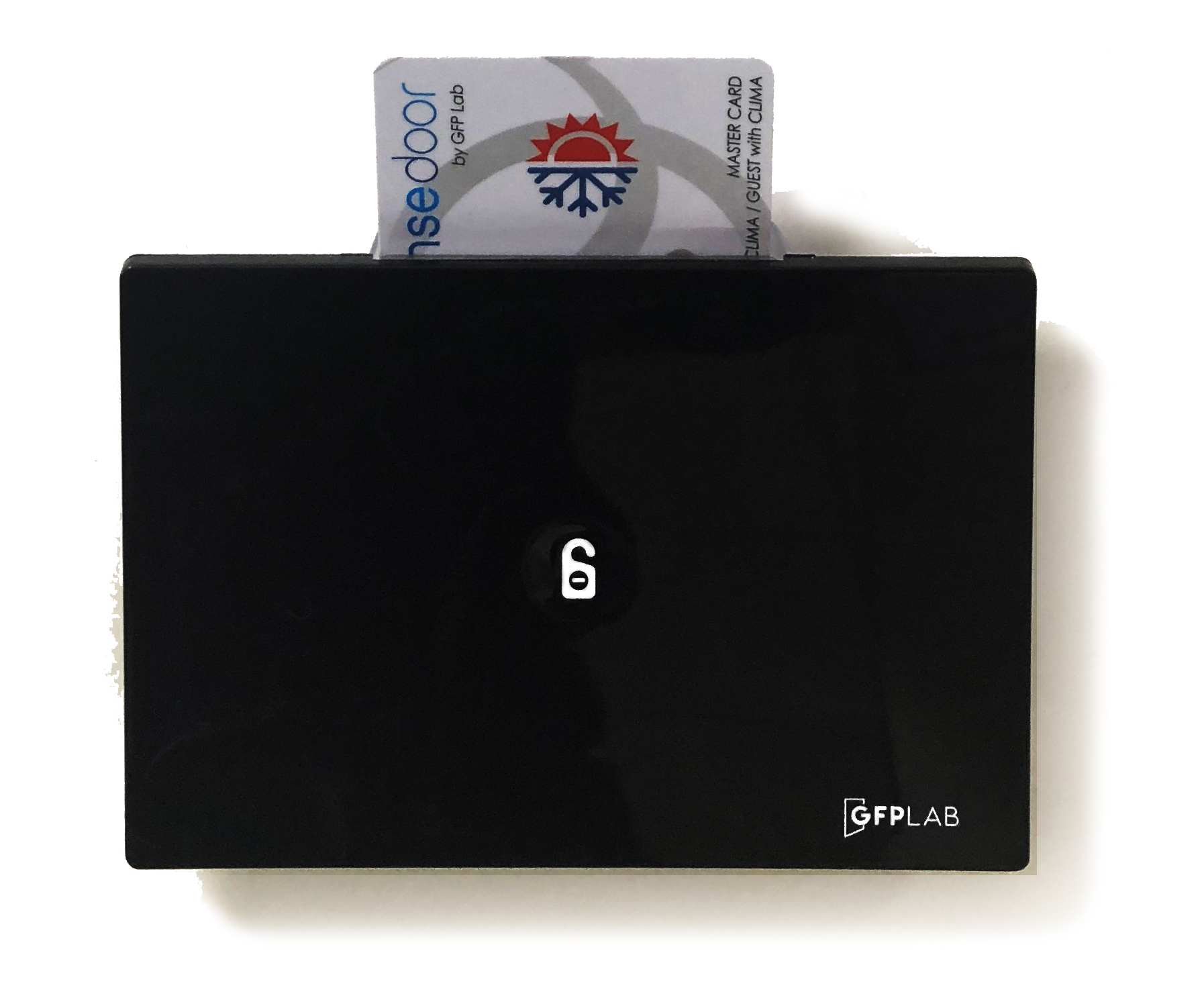 Available in white version and with optional customizable plexiglass frame with room number (back-lit by the reader itself).