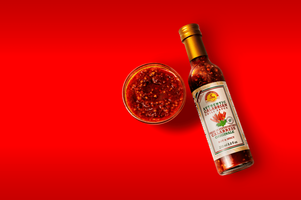 Calabrian Chili Sauce strikes the palate with an intense heat that gradually gives way to the slightly tangy notes of vinegar and the fresh, fruity flavor of our traditional Calabrian chili peppers. The result is a surprising and truly unique sauce, defined by a deep and unmistakable taste.