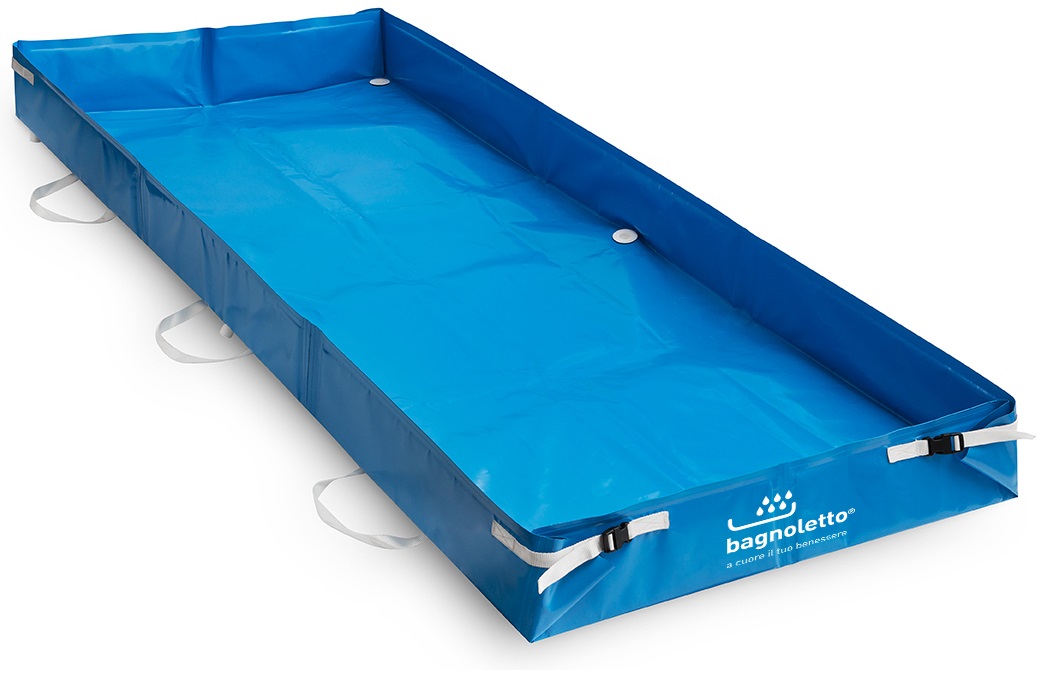 BAGNOLETTO is a PVC sheet with stiffened side edges that are lifted and hooked together to form a con-tainer. It is positioned more or less in the same way as when changing the sheet with the patient on the bed. The operation is facilitated by the gripping straps.