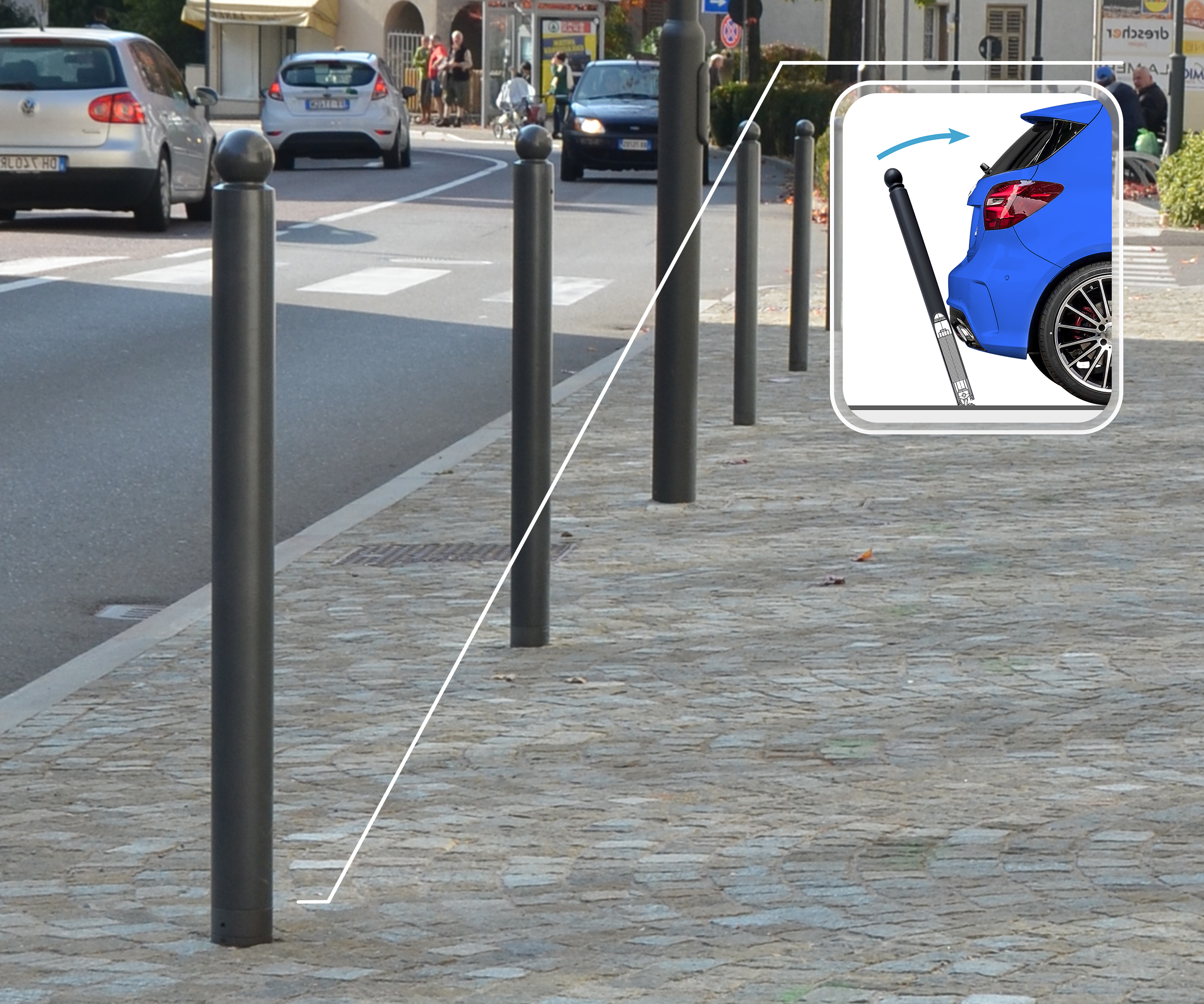A differenza dei tradizionali pali e dissuasori, i nostri prodotti non si danneggiano né si deformano all'impatto. Il sistema Augustaflex® assorbe la forza dell'urto, flettendosi e tornando rapidamente alla posizione verticale. Questo comporta minori danni, costi di manutenzione ridotti e un aspetto sempre ordinato.