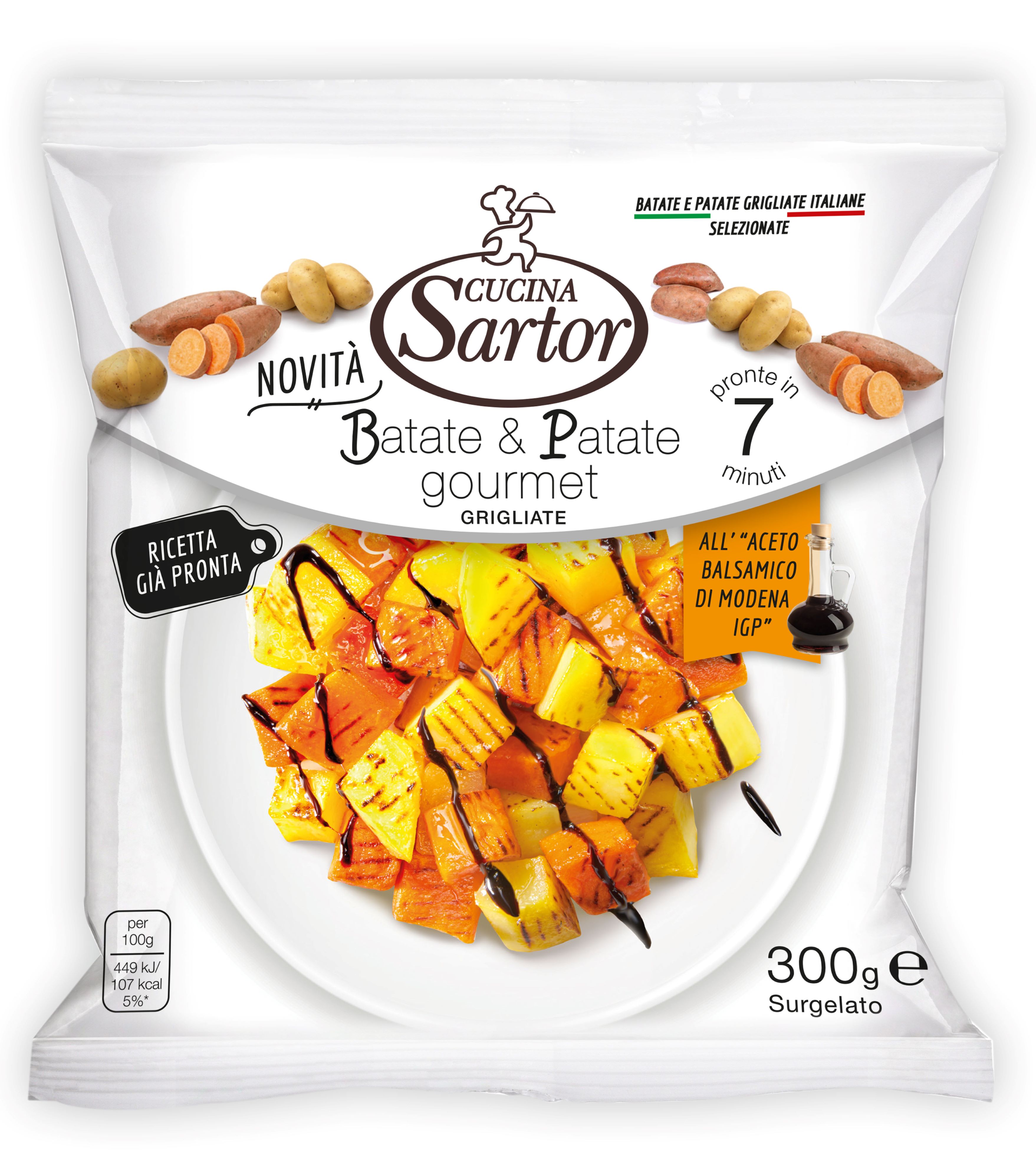 Ingredients: Grilled potatoes, grilled sweet potatoes, balsamic vinegar of Modena IGP, extra virgin olive oil, salt, rice starch, garlic.