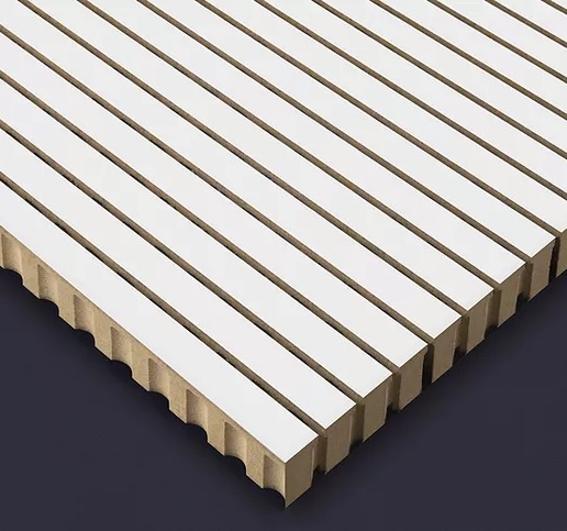 Sound-absorbing wall cladding, made with Acousystem-type acoustic panelling, in FSC ® certified MDF, made up of horizontal staves measuring 2816X192x16mm, drilled and milled, with a 10 mm diameter hole, 3 mm milling at 29 mm gaps, bendable up to a radius of about 3300 mm, with surface decorated with melamine cover