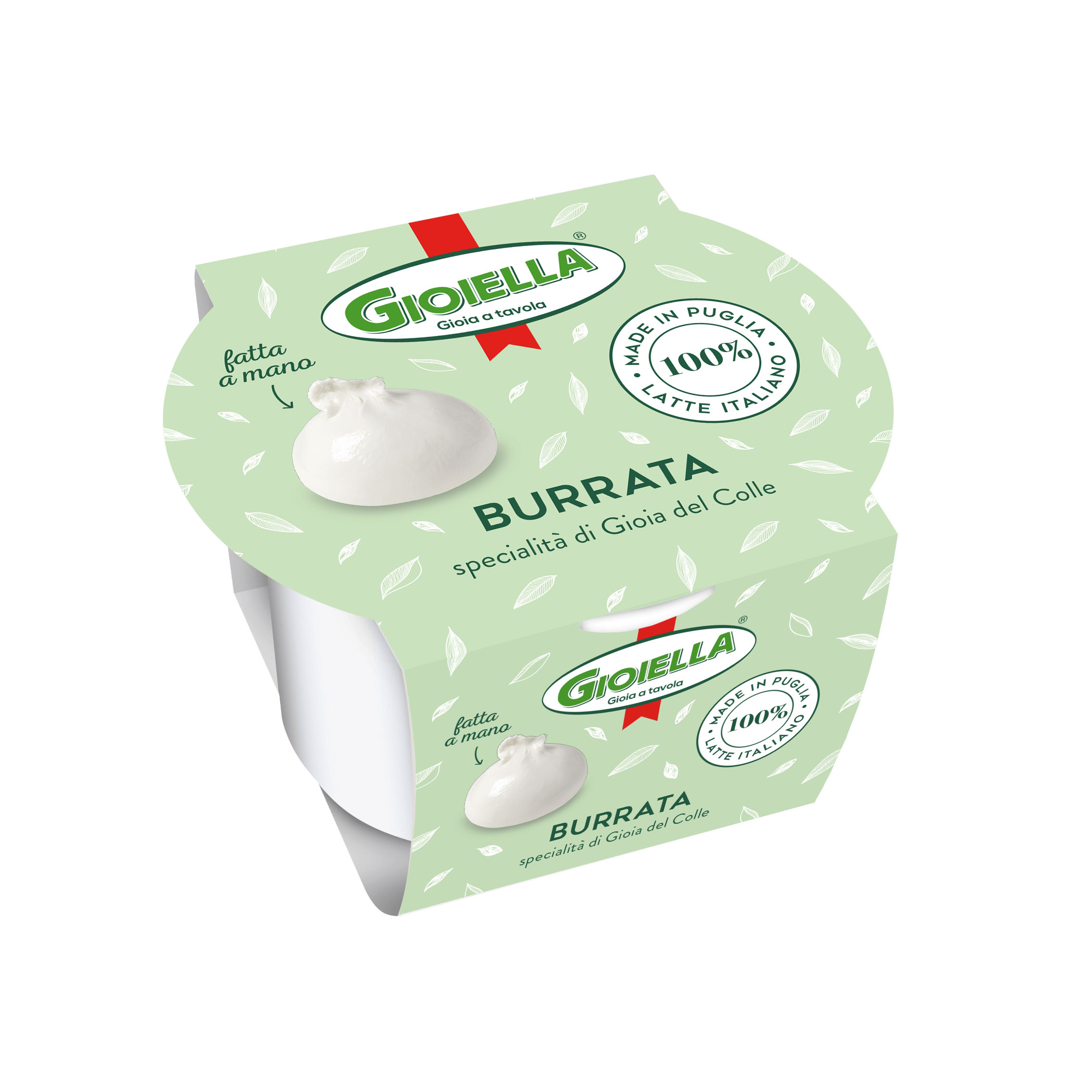 Formaggio fresco a pasta filata con cuore di panna. Prodotto ottenuto da pasta filata sfilacciata con aggiunta di panna UHT (stracciatella) in sfoglia di pasta filata (burrata).