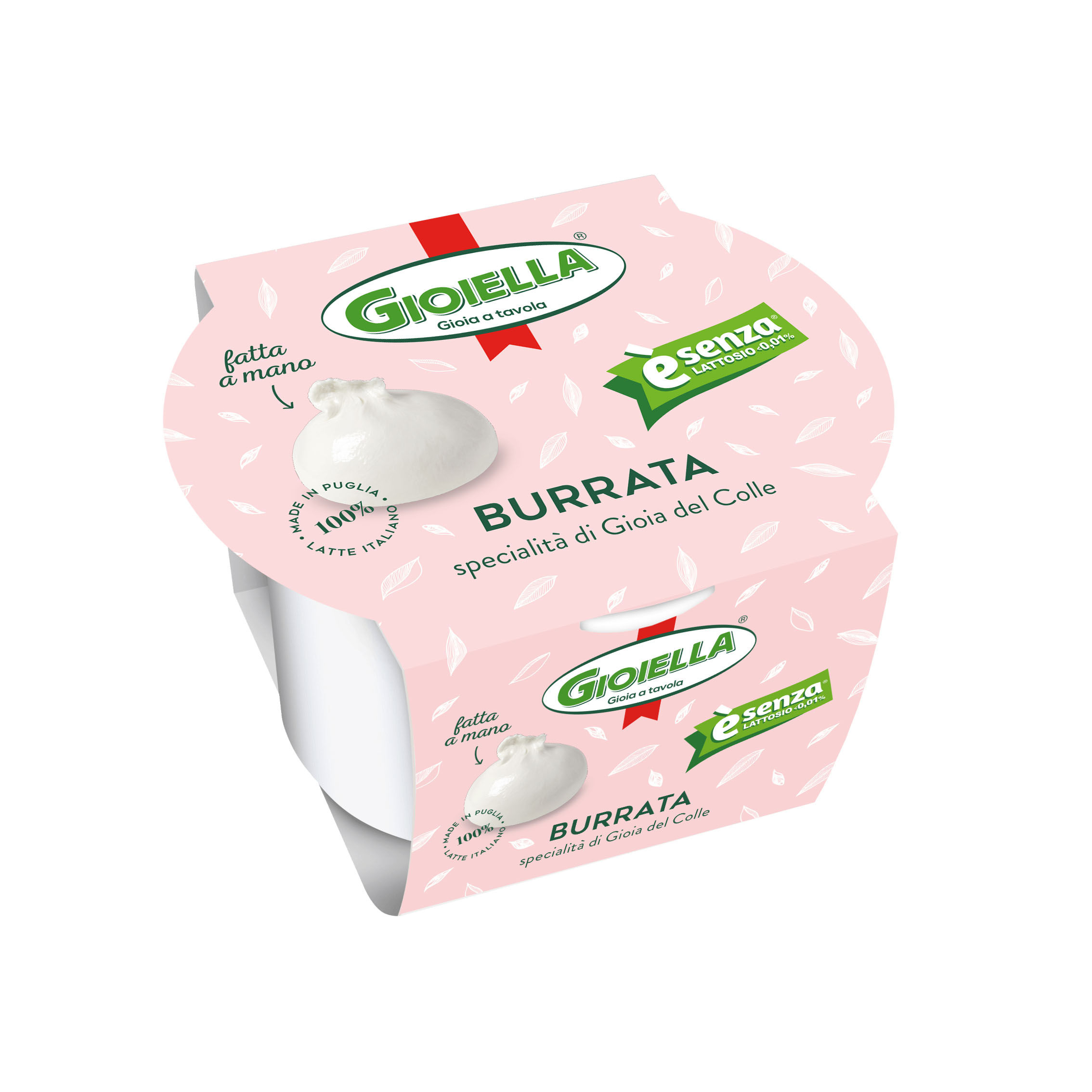 Formaggio fresco a pasta filata con panna. Prodotto ottenuto da pasta filata sfilacciata con aggiunta di panna UHT (stracciatella) in sfoglia di pasta filata (burrata) con contenuto in lattosio inferiore allo 0,01%.