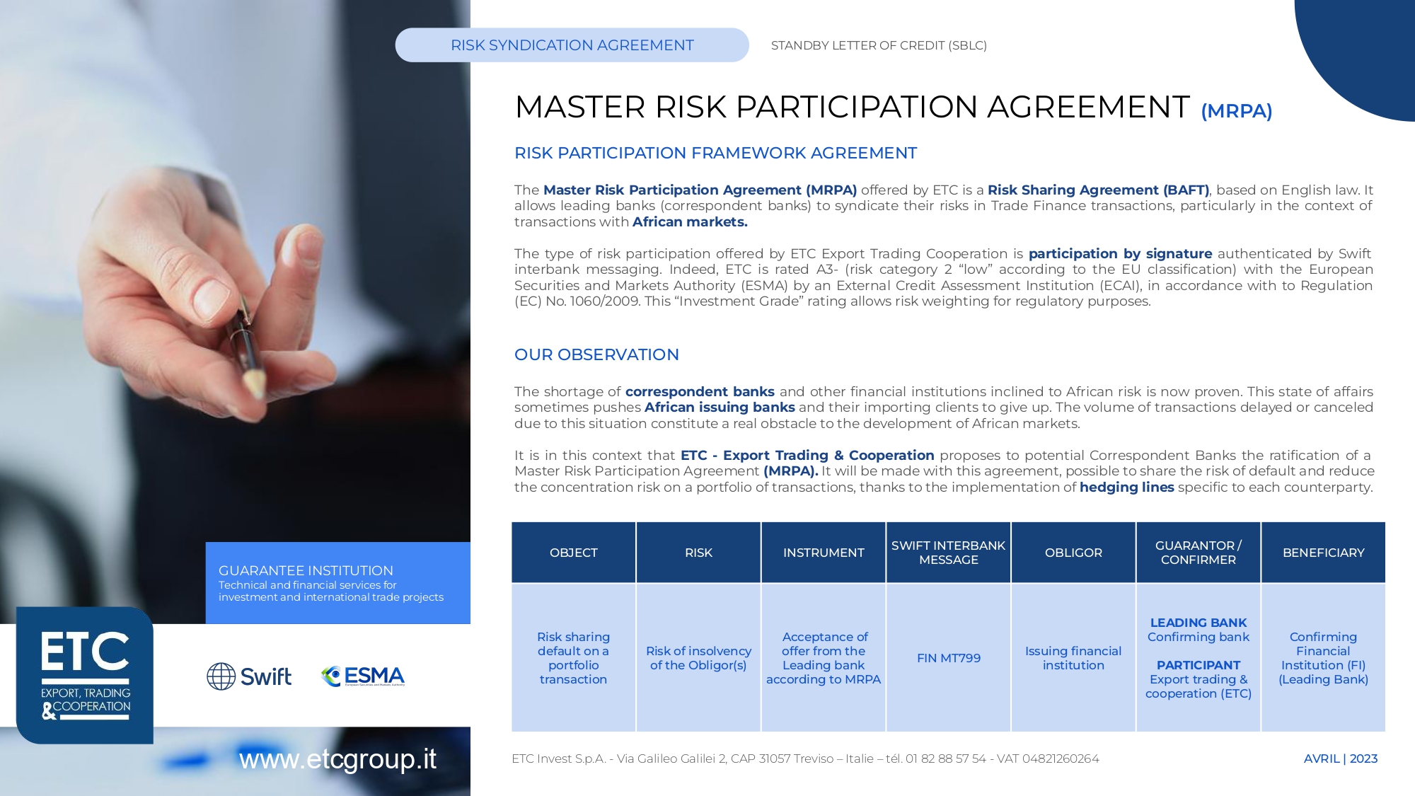 The Master Risk Participation Agreement (MRPA) offered by ETC is a Risk Sharing Agreement (BAFT), based on English law. It