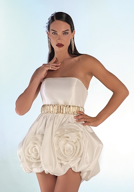 With a deep passion for sartorial tradition and a flair for innovation, Floriana Formisano creates garments that blend classic tailoring with contemporary design. Each piece is a celebration of femininity, featuring luxurious fabrics such as mikado, taffeta, and silk, enriched with intricate details like sequins, fringing, and jewel embellishments.