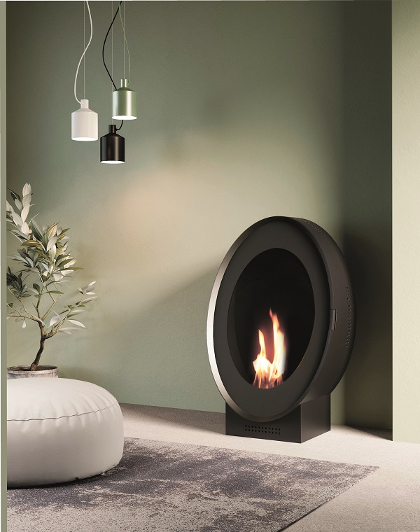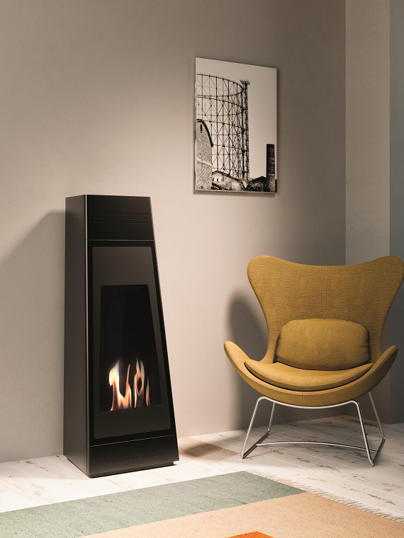Free-standing bio-fireplace, does not require a flue and electrical connection, runs on bioethanol.