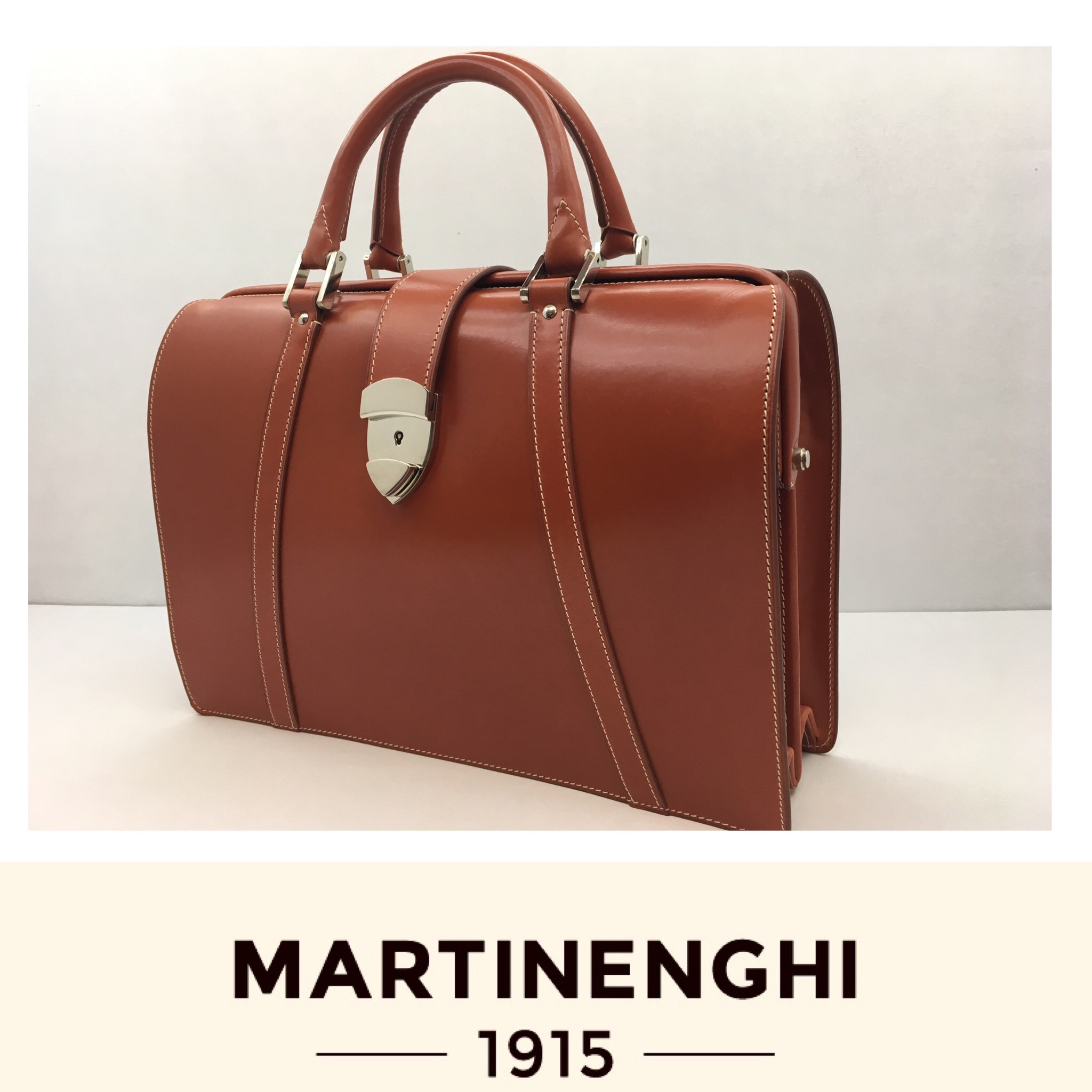 Doc is a briefcase in “bridle” calfskin with nickel plated metals and removable leather shoulder strap. Organized in two compartments divided by a partition with two free leather pockets and two pen holders.