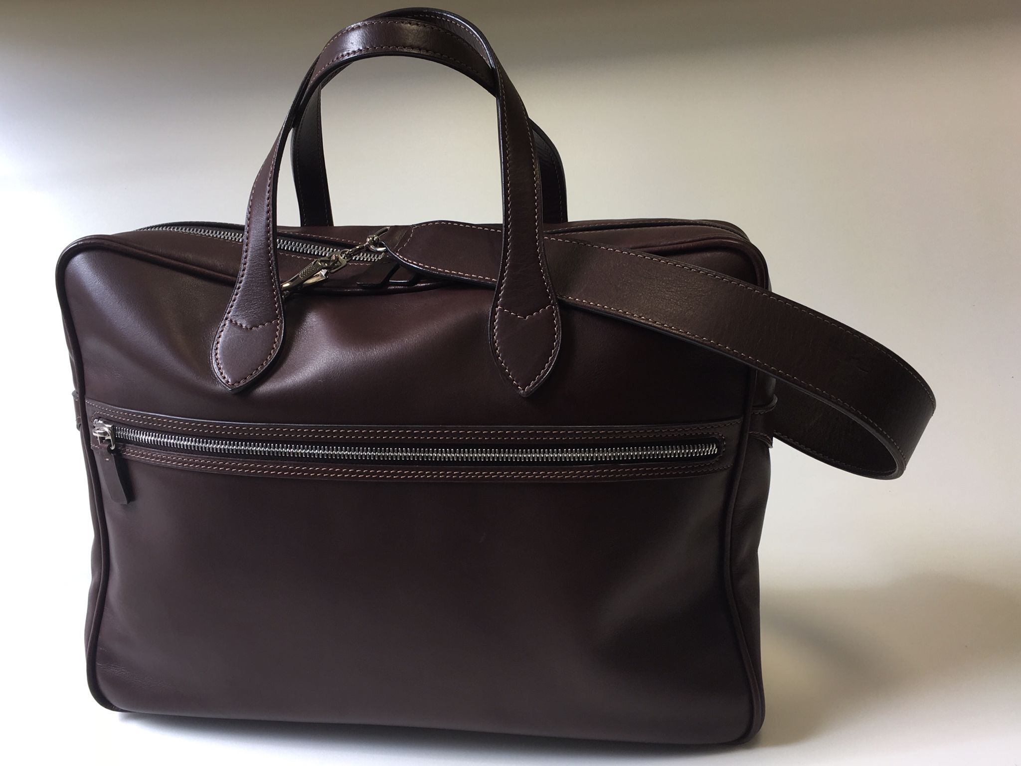 Business Bag, is a soft pattern realized in 100% italian calf dark brown leather; one big external zip and a removable shoulder strap.