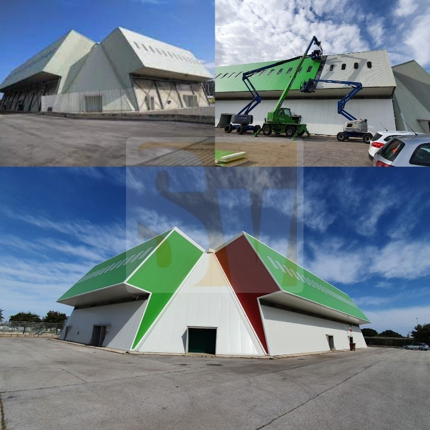 Total cladding of the warehouse of 10,000 square meters, made with corrugated sheets “Origoni Zanoletti”, Smoke and heat evacuators “Zenitali” (height 68.00mt), Translucent in Alveolar Polycarbonate, Complementary tinsmiths and gutters, with our staff working in acrobatic construction (Rock climbers - Work on Rope)