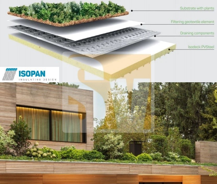 Mineral wool insulation - Wood coating - PIR insulated panels such as ISOPAN - Green Roof totally waterproof and upper planting