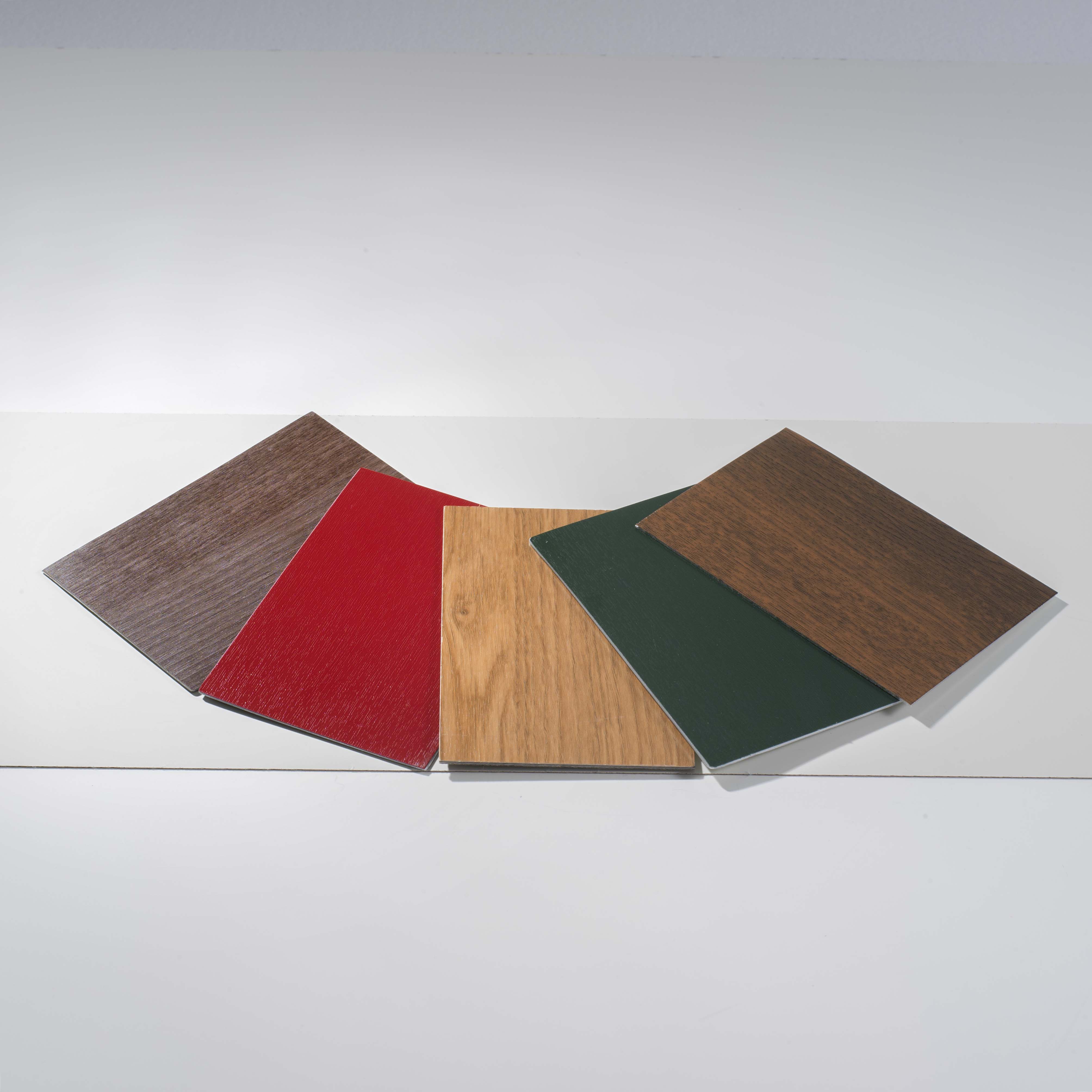 Aluminium and steel sheets are processed appropriately, coated on one side with a wood-look or plain-colour PVC film for exterior applications (manufactured by RENOLIT® or HORNSCHUCH®), and then glued by means of a specific outdoor adhesive. The finished side is finally coated with a removable protective film.