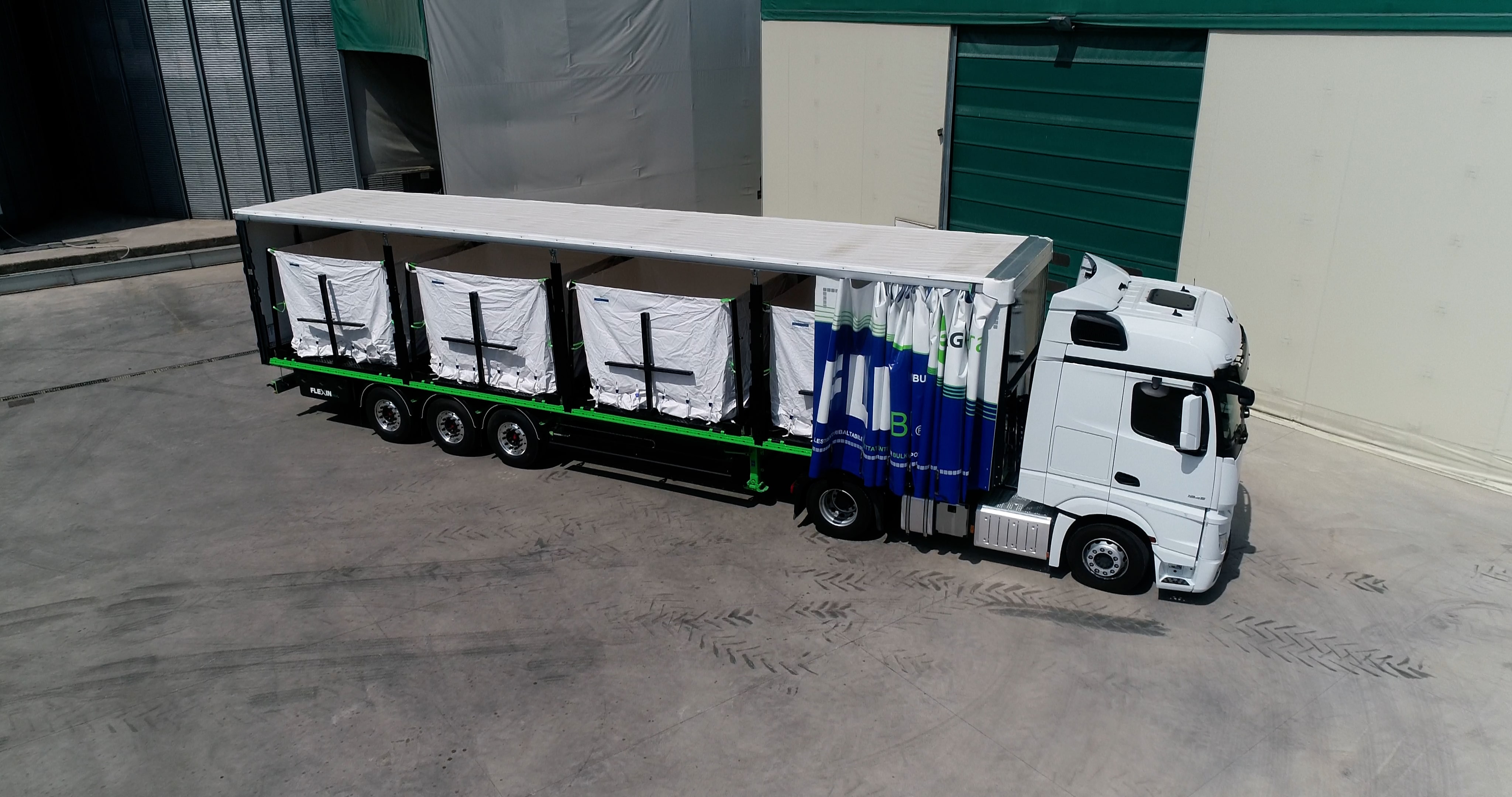 The system is formed by 4 collapsible units placed uner the floor that can be opened in less than 10 minutes, transforming a standard curtainsider in a tipping semitrailer composed by 4 independet units with a tota capability of 44m³.