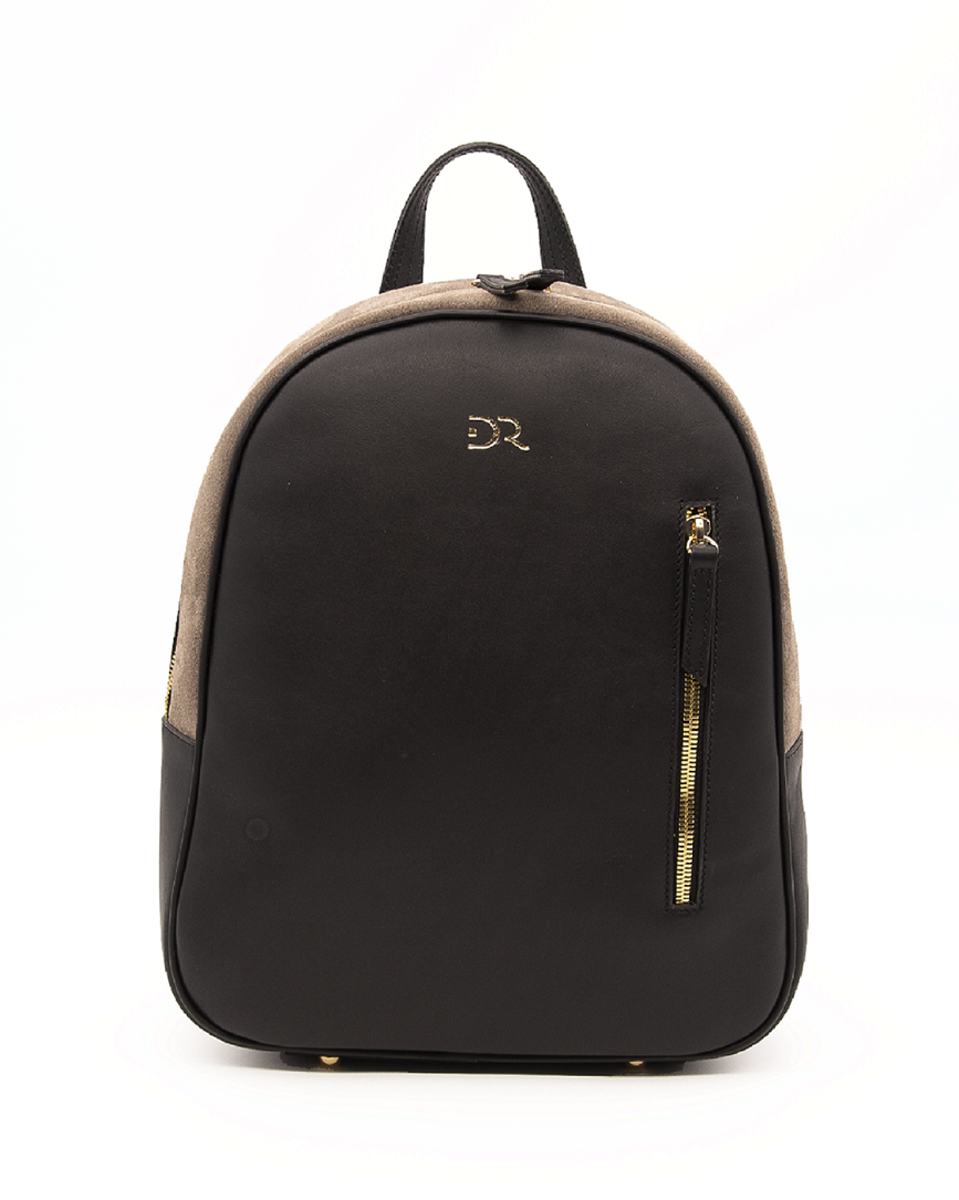 Rounded backpack in smooth claf leather together with suede for side part.