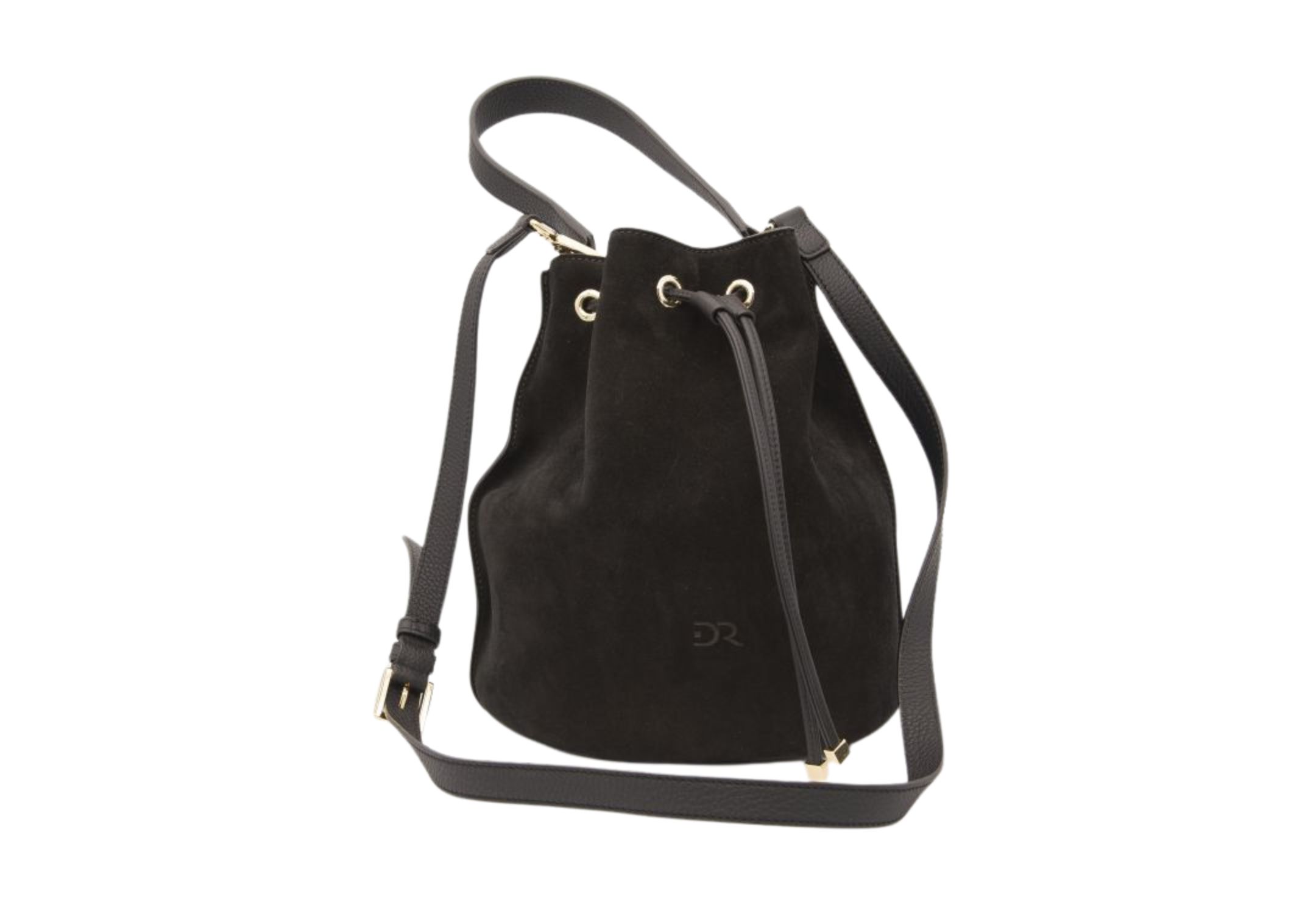 Bucket bag made of soft suede with a practical leather drawstring closure. Can be worn crossbody or with the practical handle. Zippered pocket and cell phone pocket. Practical and elegant.