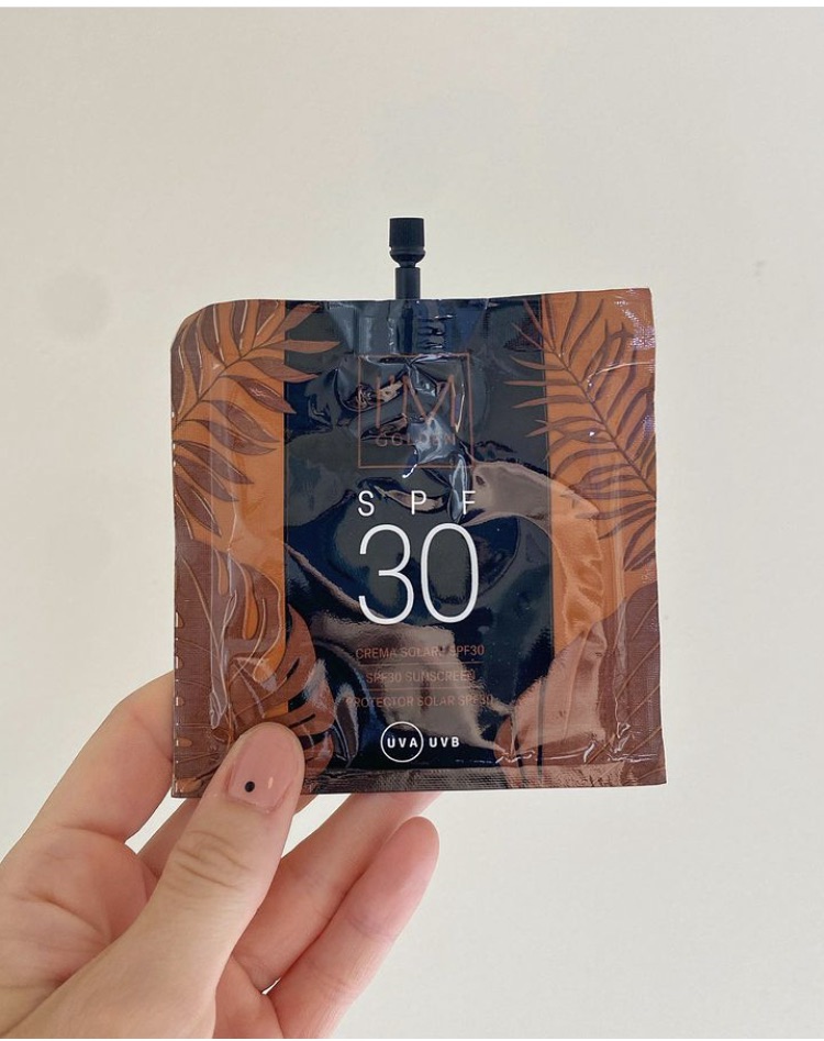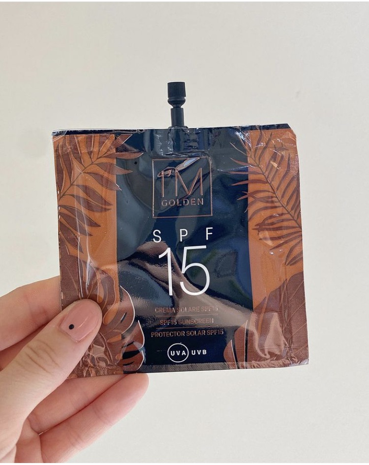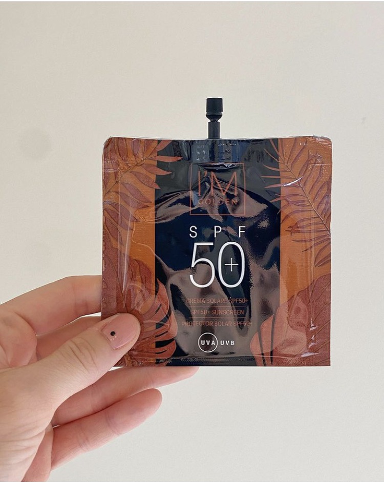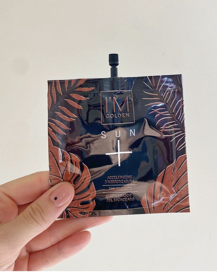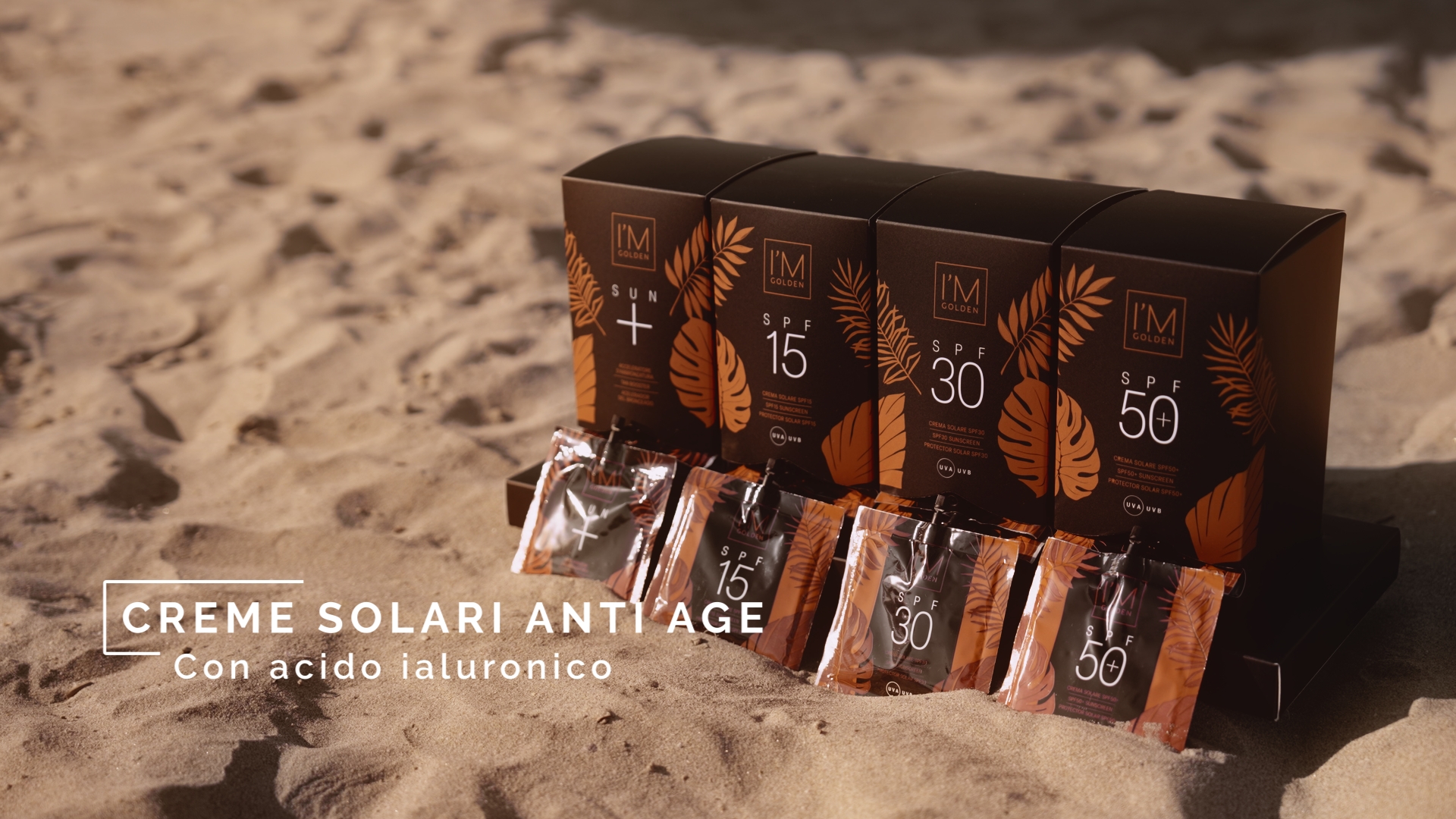 THE BLACK AND BRONZE DISPLAY CONTAINS ALL FOUR REFERENCES OF THE I'M GOLDEN LINE OF SUN CREAMS WITH HYALURONIC ACID, EACH COLUMN CONTAINS 25 SACHETS OF THE SAME REFERENCE.