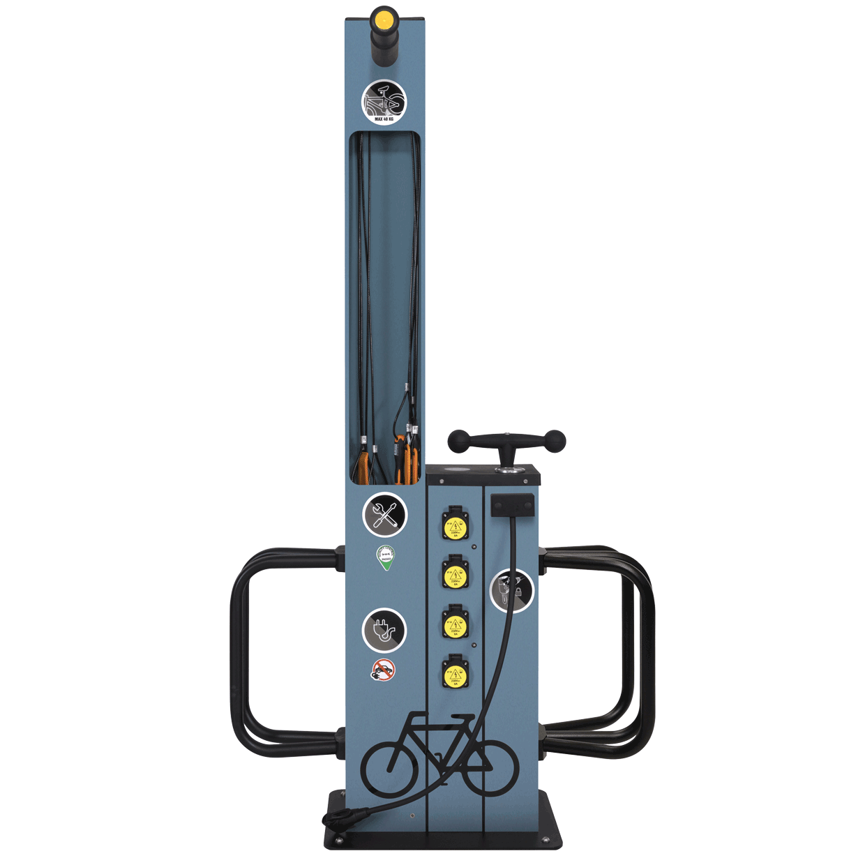Aluminum anticorodal devices with Schuko outlets for E-bike charging, available in various models with or without maintenance tools and pump for bicycle upkeep.
