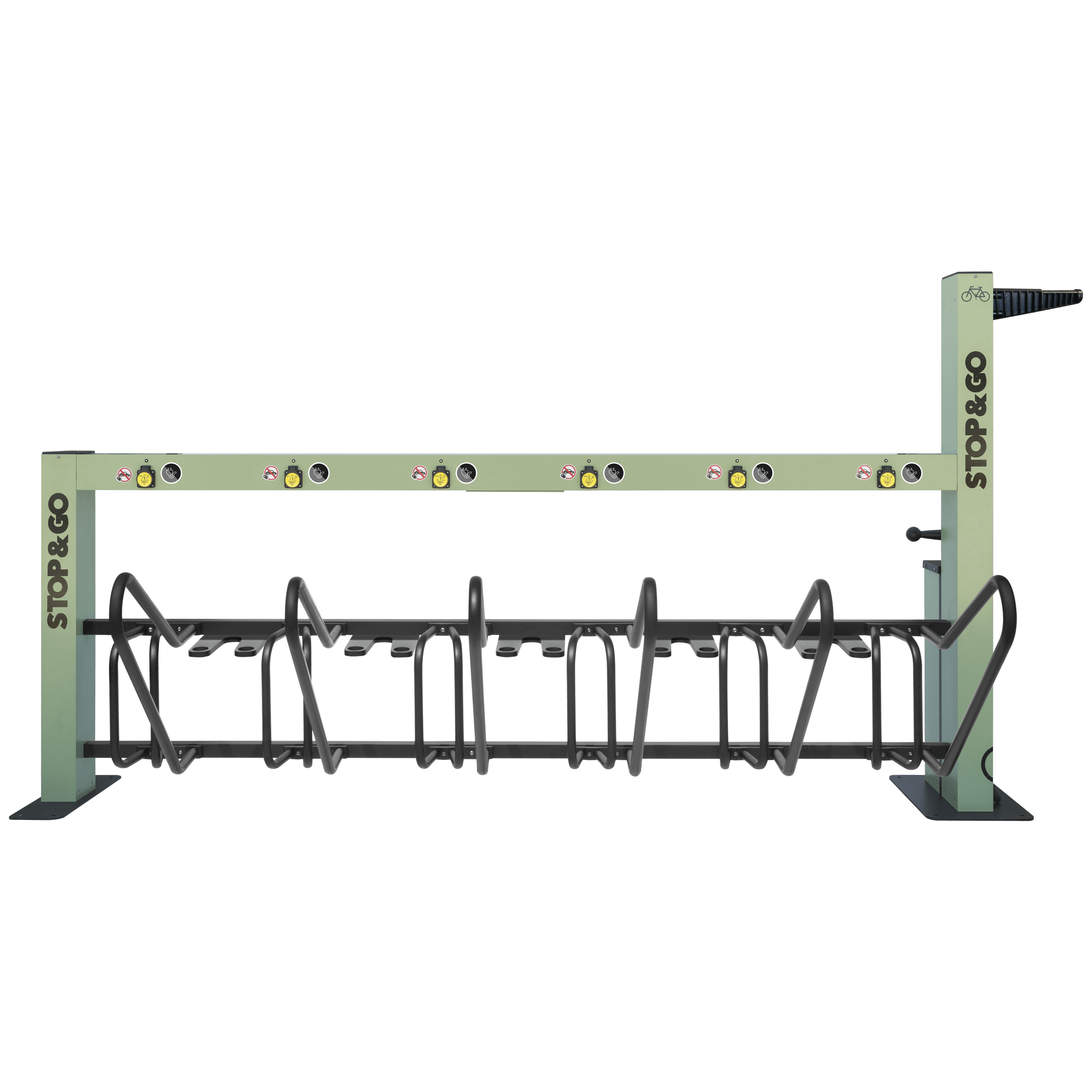 Aluminum anticorodal bike racks for bicycle parking, also available in the “electric” version with outlets for e-bike charging.