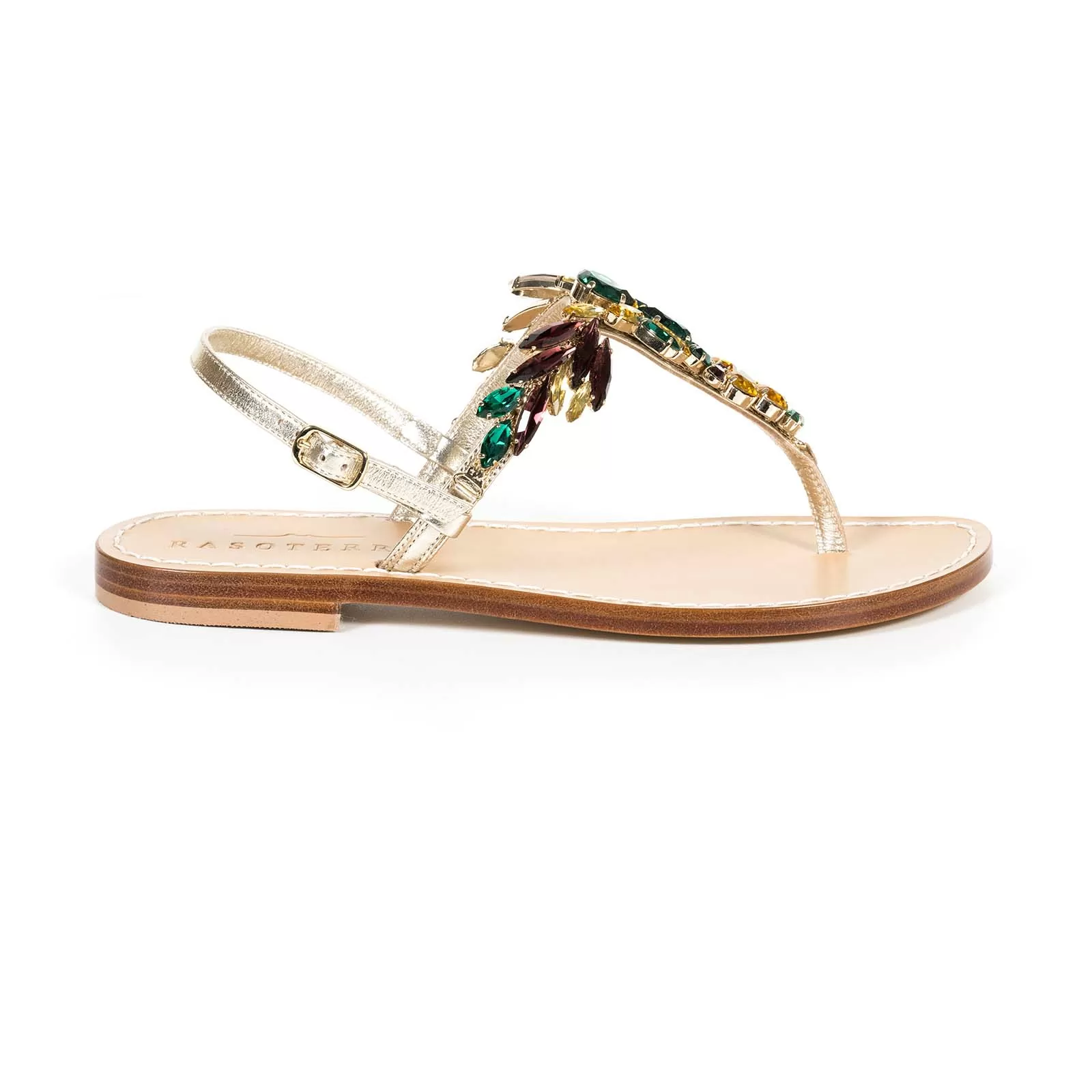 Filicudi Sandal is a flip-flop sandal featuring an iconic T-shape studded with Emerald Green, Amber yellow and Purple precious crystals. This sandal also has an ankle strap in laminated leather and a buckle to adjust its width according to the needs.