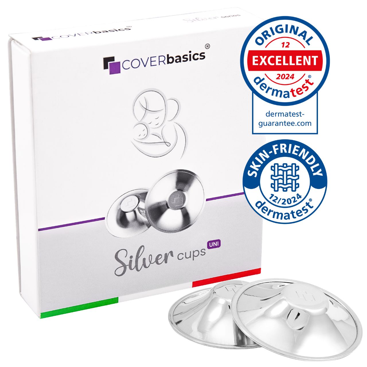 COVERbasics Silver Nursing Cups are silver nipple shields designed to protect, prevent, and soothe sore or cracked nipples during breastfeeding. Thanks to the natural properties of silver, they create a protective barrier that helps maintain hygiene and supports the natural healing process without the use of creams or ointments.