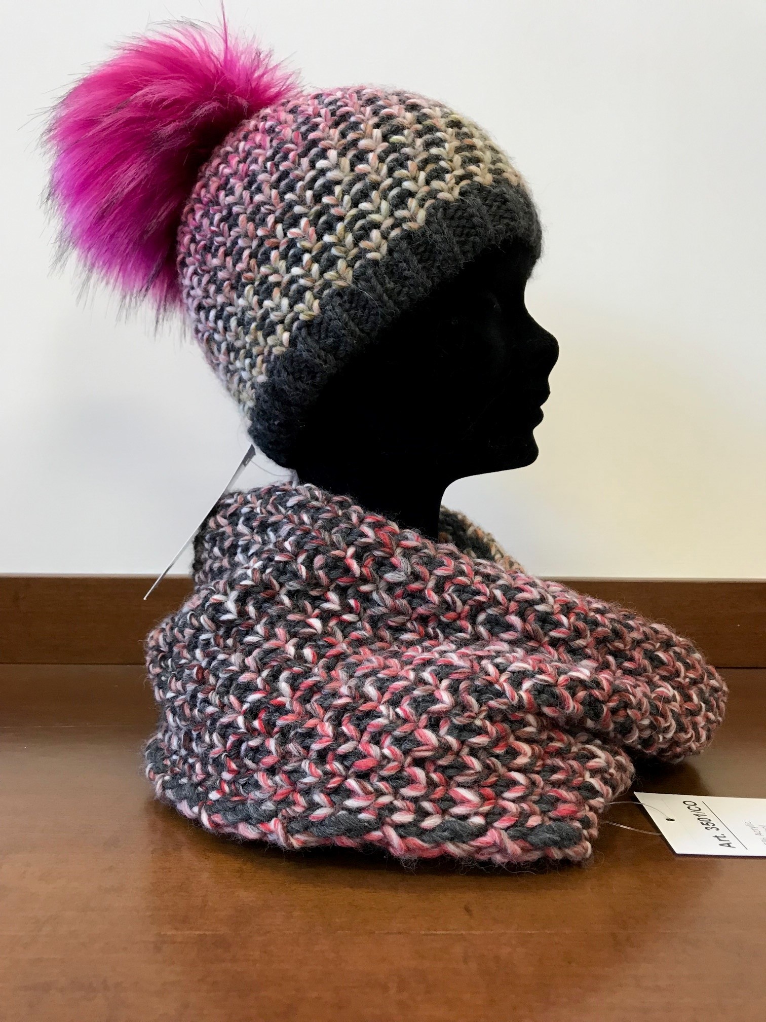 These items are made with printed yarn with a Fake Fur Pom in a wool blend composition