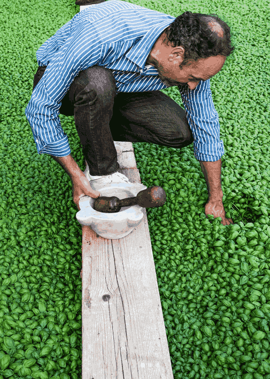 This basil is rarely seen outside of Liguria, where it thrives in the mild coastal climate. Paolo cultivates his crop beneath traditional wooden structures draped with netting, creating a greenhouse-style environment. He lays down narrow wooden bridges balancing over seas of bright basil – handpicking stem by delicate stem.
