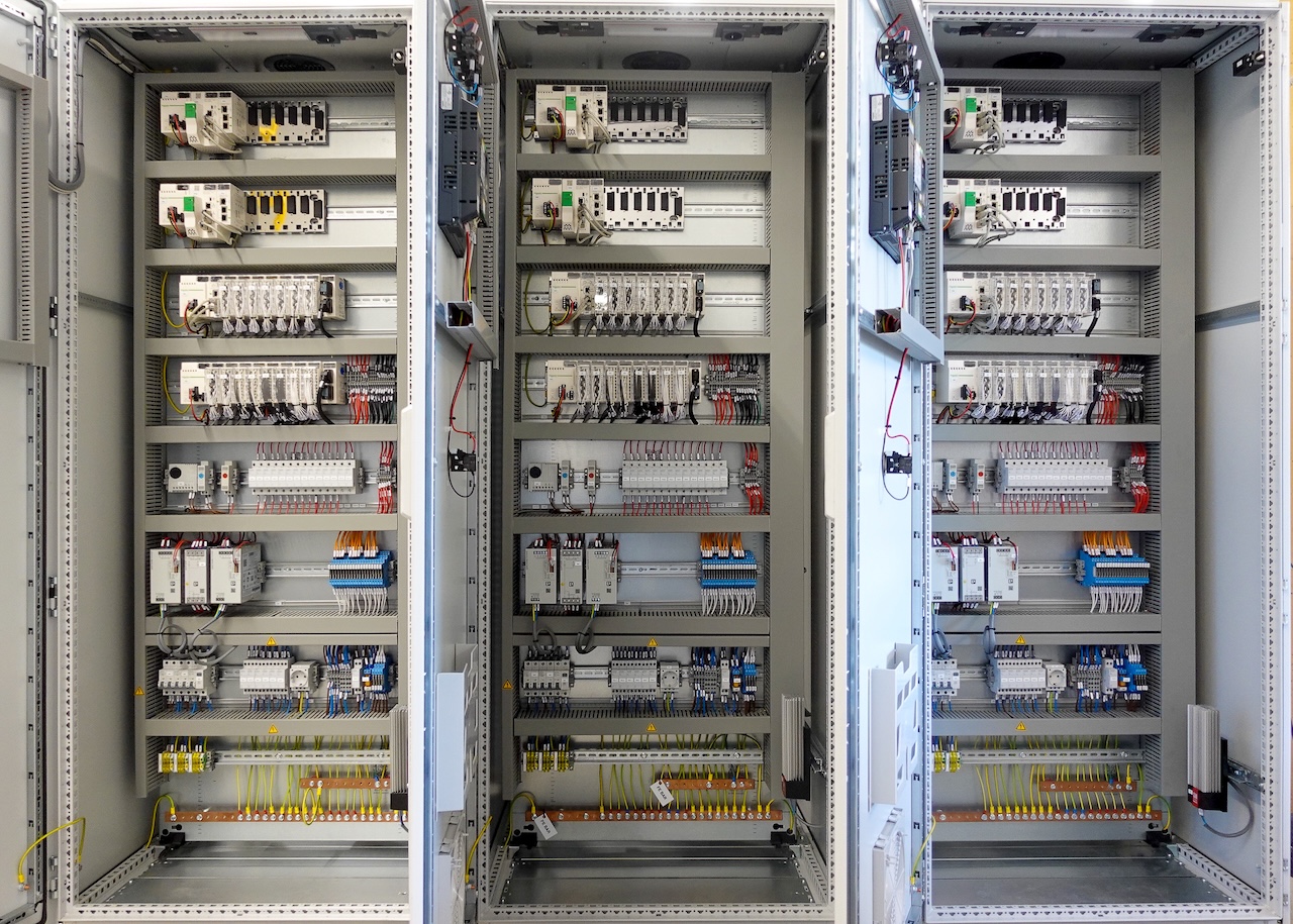Unit control panel based on Schneider PLC designed to control three gas centrifugal compressors with load-sharing logics.