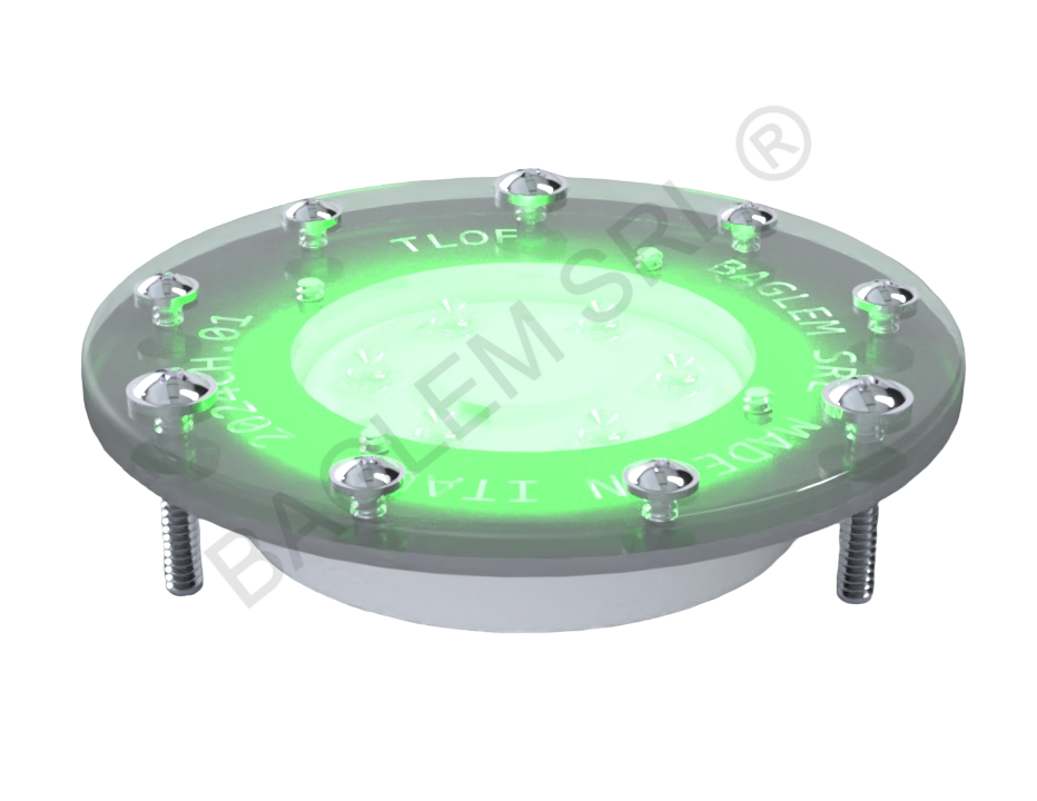 The recessed omnidirectional TLOF light Baglem with a fixed green light at 30 Cd is designed to precisely delineate the TLOF area dedicated to helicopter landings and take-offs, ensuring high visibility and safety during nighttime operations. Made with high-quality materials, it features a lower body made of reinforced insulated composite material, resistant to extreme environmental conditions. The upper body is made of impact-resistant transparent polycarbonate, with polymethyl methacrylate lenses that ensure uniform light distribution. The light source consists of 6 redundant SMD LEDs that provide continuous and reliable illumination, even in the event of partial failures, enhancing safety and efficiency during night operations. The mounting system uses 3 Thorn screws arranged at 120 degrees for stable and secure installation, while an anti-condensation valve prevents internal moisture buildup, extending the product's lifespan. Power supply: 12-24 VDC. It includes a power supply through the Baglem Driver, equipped with a cable gland and 20 cm of cable with an IP68 connector for easy maintenance or replacement. Other power supply types are available upon request. Sealed with silicone gaskets, entirely made in Italy, it represents a symbol of quality and reliability in the industry.