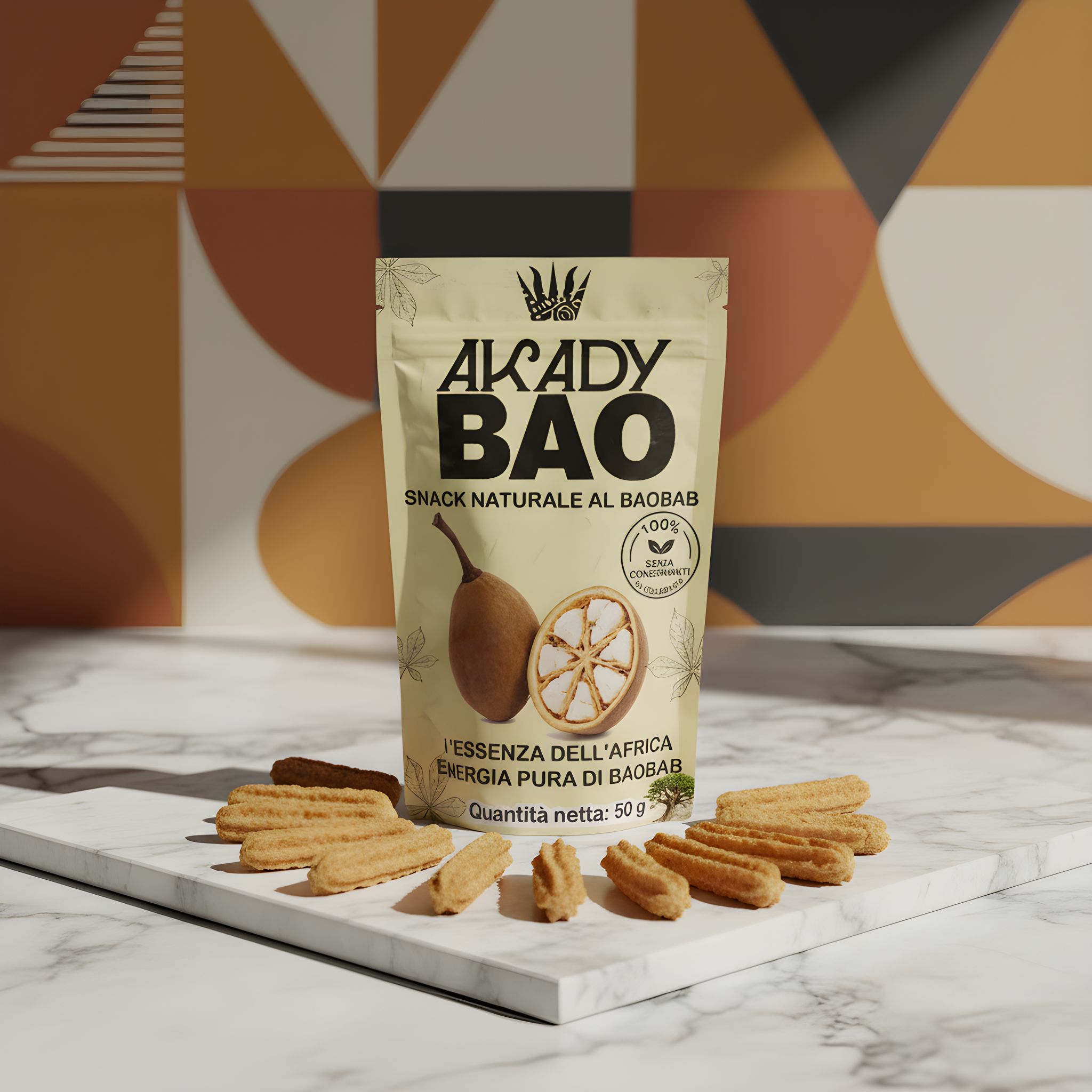 AKADY BAO is a premium snack based on baobab, a symbolic African ingredient known for its distinctive taste and cultural value. It is blended with natural cane sugar and vanilla for aroma, creating a balanced and recognizable flavor profile.