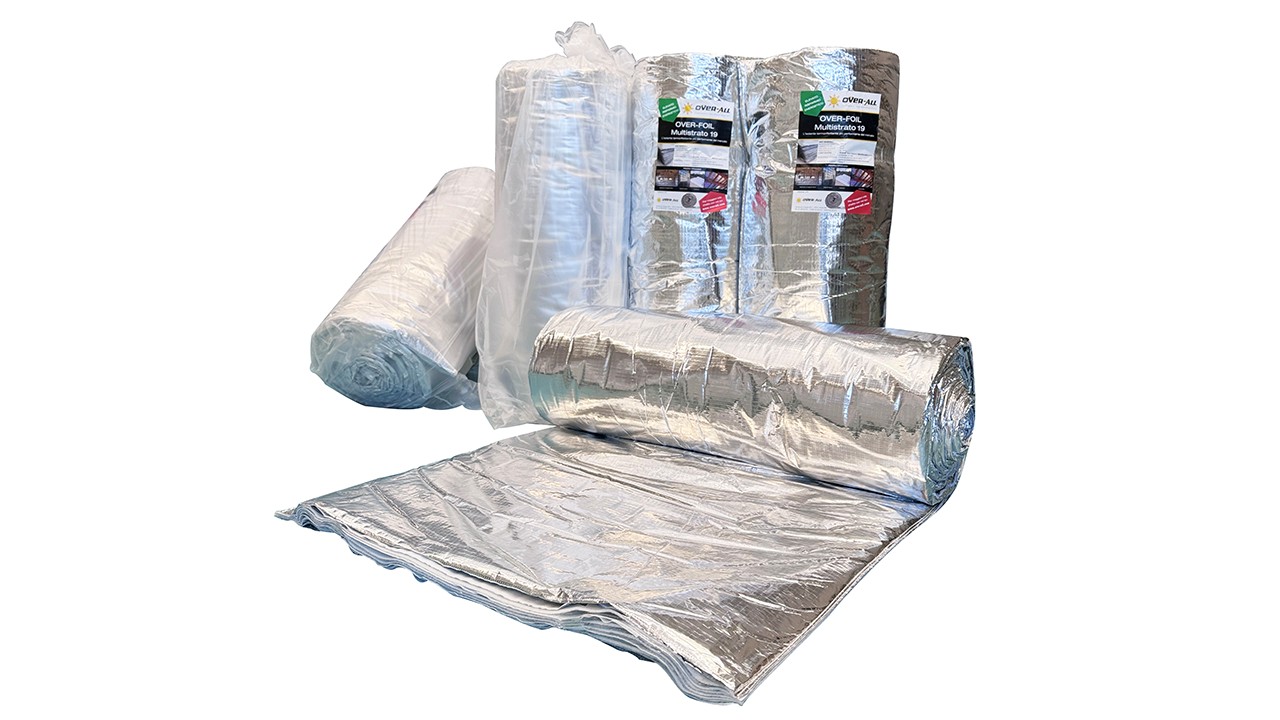 Over-foil Multistrato 19 is the best performing pure aluminium reflective insulation on the market, environmentally sustainable and certified. Thanks to its high thermal insulation performance, tested in accordance with the new UNI EN 22097 reference standard, it is the ideal insulation for limiting thicknesses in renovations and new constructions in combination with drywall systems. Used in walls and roofs, it makes it possible to exploit the air spaces created, thus obtaining high-performance structures with low thickness. Over-foil Multistrato 19 consists of 19 layers with the 2 outer faces of pure aluminium protected and reinforced with net.