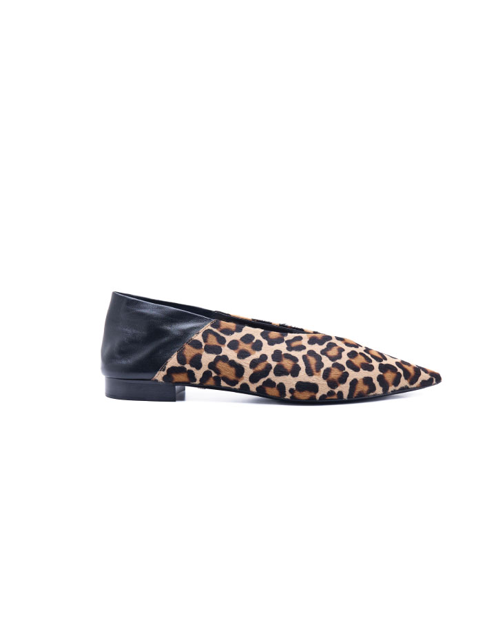 Leonor Napoli's leopard print pony skin and black nappa leather ballet flats are the ideal choice for those looking for a refined and bold style for the cold season. Made from 100% pony skin, with a leather sole and 15 mm low heel, they guarantee comfort and quality. The combination of pony skin and animal print adds character to any outfit, perfect for a sophisticated and modern winter look.