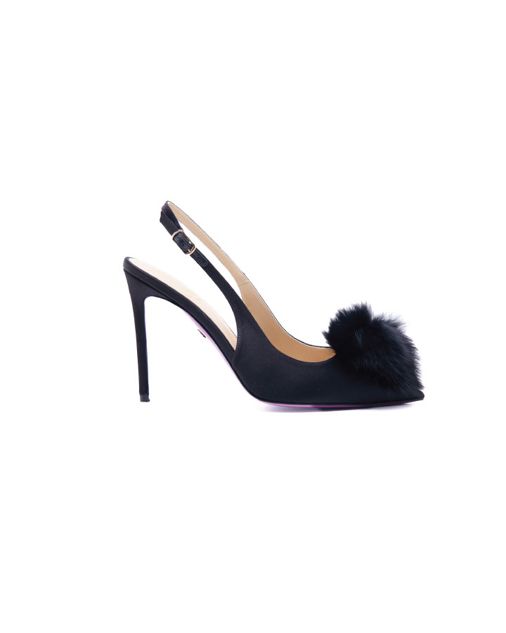 Theatrical elegance defines Leonor Napoli's black satin slingback. Crafted from refined satin, this black satin shoe stands out for its iconic matching pompom, a detail that adds movement and personality. The 4-inch heel enhances the silhouette, while the 100% leather sole ensures a stable and comfortable fit. A sophisticated and bold style, perfect for the winter season and special occasions.