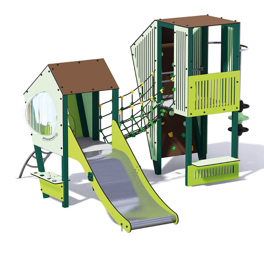 Inclusive & eco-friendly multi-function play structure. Age +2. Materials: poles in 70% rice husk + 30% recycled polyethilene, panels in recycled polyethilene, steel & roto-molding climbing elements, stainless steel slide.