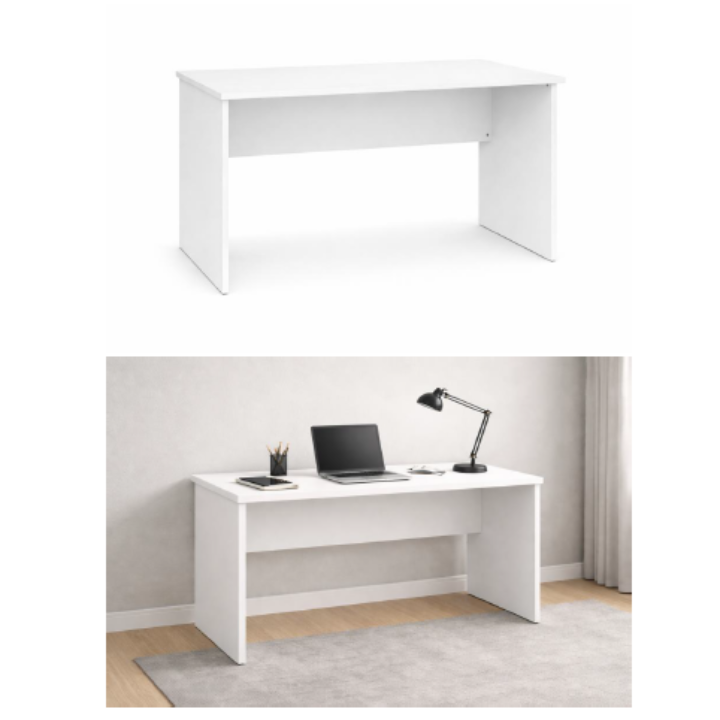 Office workstation desk made entirely of melamine-coated chipboard, designed for continuous professional use. The desk features a modesty panel to cover the legs, ensuring privacy and decorum in the workspace. The underside features non-slip rubber feet.