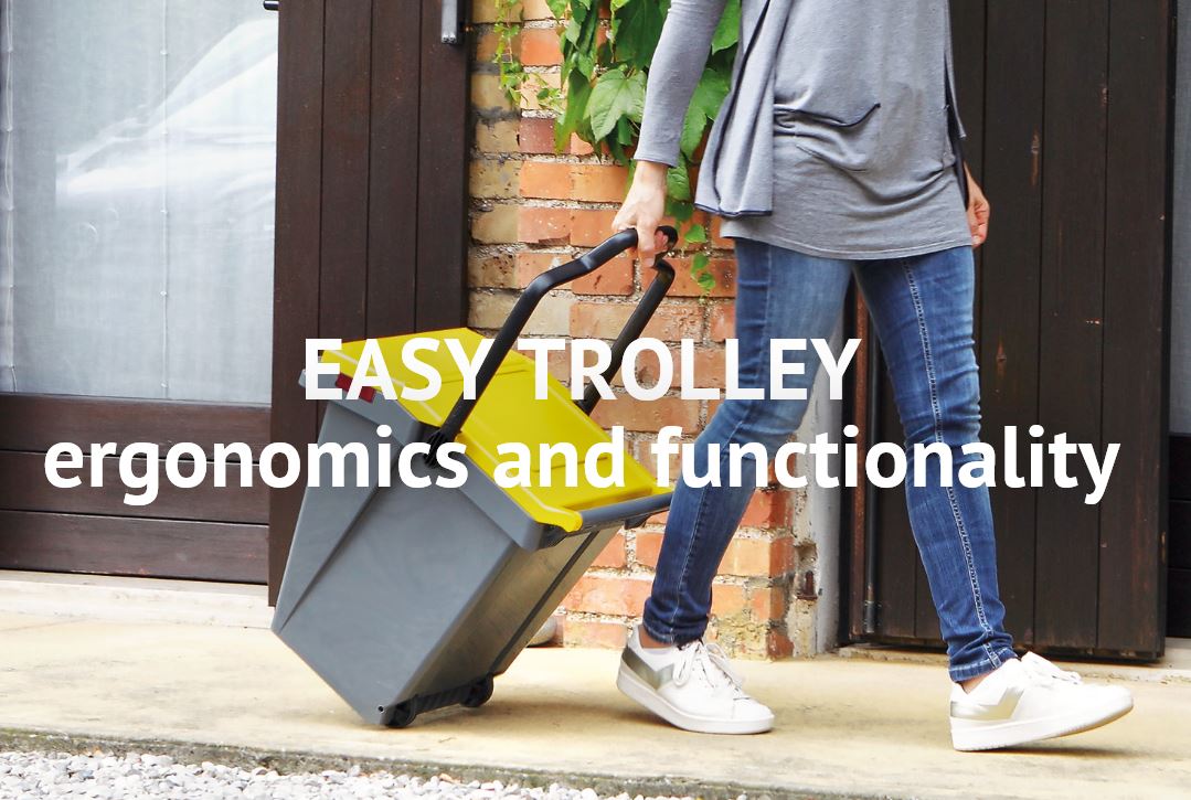 Easy Trolley, the 45L stackable indoor recycling container with wheels and a patented "trolley" handle