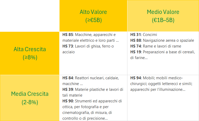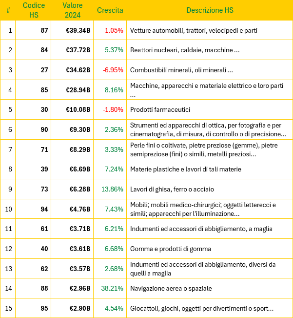 Le principali voci HS per valore in euro delle importazioni dal mondo sono state le seguenti nel 2024. Da notare come le prime 5 voci HS rappresentano oltre la metà (57.8%) del totale del valore delle importazioni.