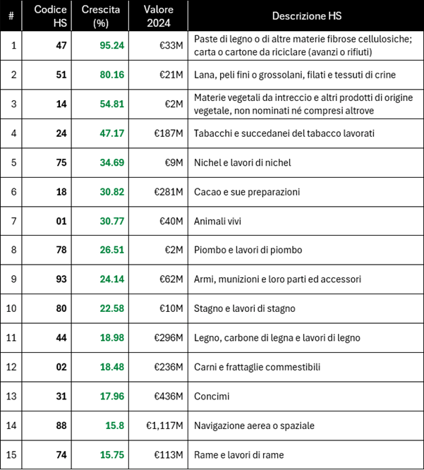 I Concimi (HS 31) registrano una crescita molto robusta del 17.96% (€436M), evidenziando la forte domanda del settore agricolo nazionale.