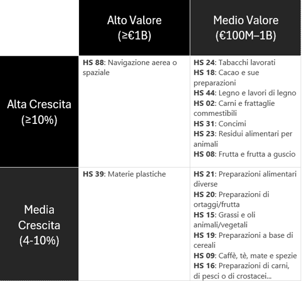 Agroalimentare (HS 18, 02): si osserva un'espansione notevole nelle importazioni di Cacao (HS 18), con un impressionante +30.82%, e di Carni (HS 02), che crescono del 18.48%.