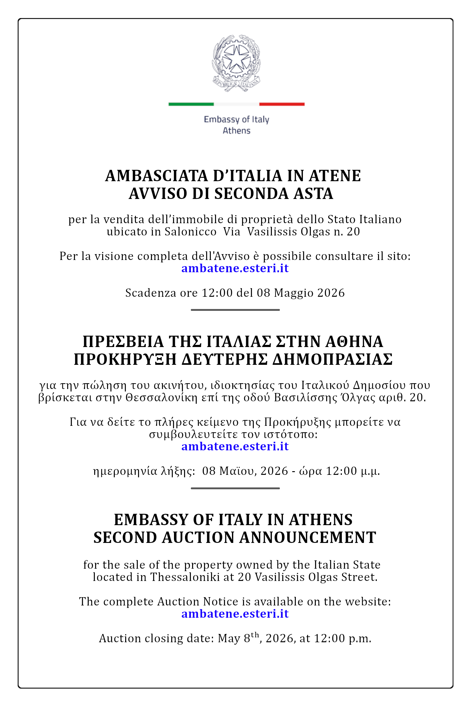 Si informa che l’Ambasciata d’Italia ad Atene ha pubblicato un “Avviso di seconda Asta Pubblica” per la